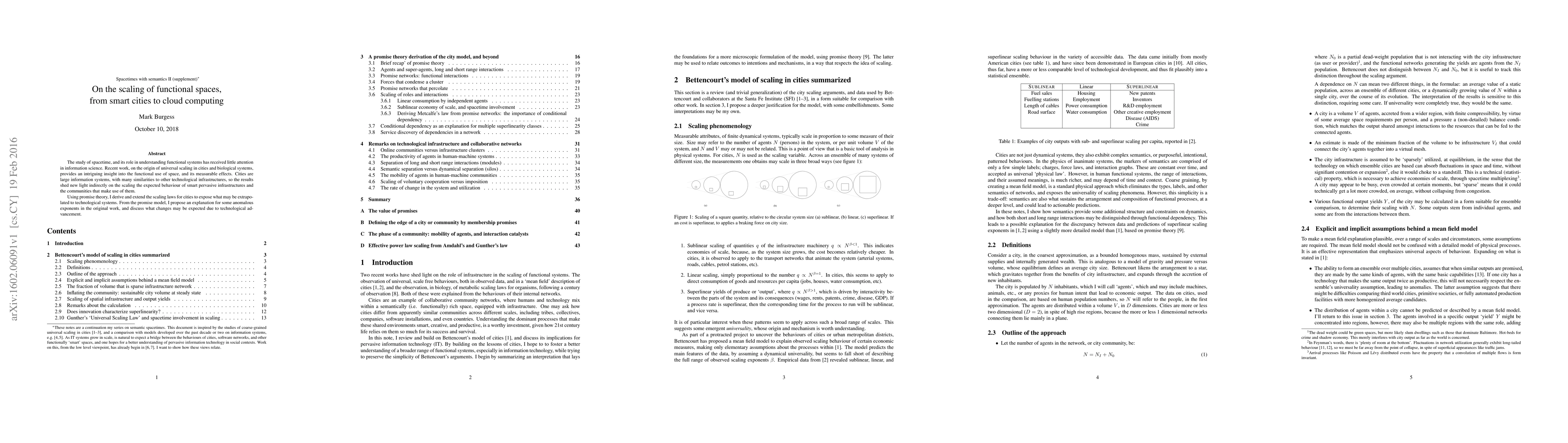 The study of spacetime, and its role in understanding functional systems has received little attention in information science. Recent work, on the origin of universal scaling in cities and biological systems, provides an intriguing insight into the functional use of space, and its measurable effects. Cities are large information systems, with many similarities to other technological infrastructures, so the results shed new light indirectly on the scaling the expected behaviour of smart pervasive infrastructures and the communities that make use of them. Using promise theory, I derive and extend the scaling laws for cities to expose what may be extrapolated to technological systems. From the promise model, I propose an explanation for some anomalous exponents in the original work, and discuss what changes may be expected due to technological advancement.
