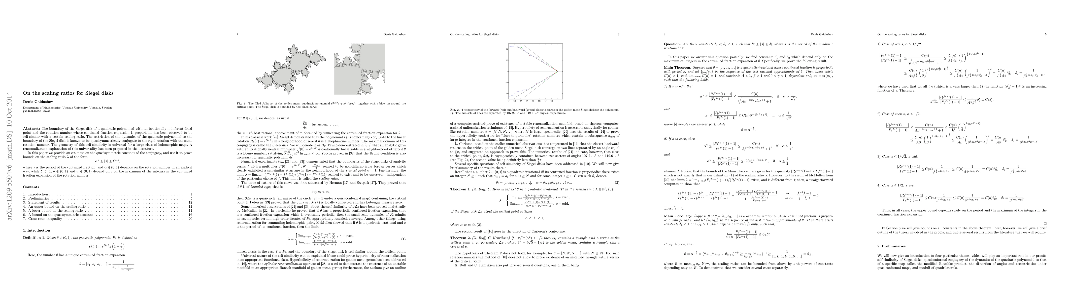 The boundary of the Siegel disk of a quadratic polynomial with an irrationally indifferent fixed point and the rotation number whose continued fraction expansion is preperiodic has been observed to be self-similar with a certain scaling ratio. The restriction of the dynamics of the quadratic polynomial to the boundary of the Siegel disk is known to be quasisymmetrically conjugate to the rigid rotation with the same rotation number. The geometry of this self-similarity is universal for a large class of holomorphic maps. A renormalization explanation of this universality has been proposed in the literature. In this paper we provide an estimate on the quasisymmetric constant of the conjugacy, and use it to prove bounds on the scaling ratio $\lambda$ of the form $$\alpha^\gamma \le |\lambda| \le C \delta^s,$$ where $s$ is the period of the continued fraction, and $\alpha \in (0,1)$ depends on the rotation number in an explicit way, while $C>1$, $\delta \in (0,1)$ and $\gamma \in (0,1)$ depend only on the maximum of the integers in the continued fraction expansion of the rotation number.