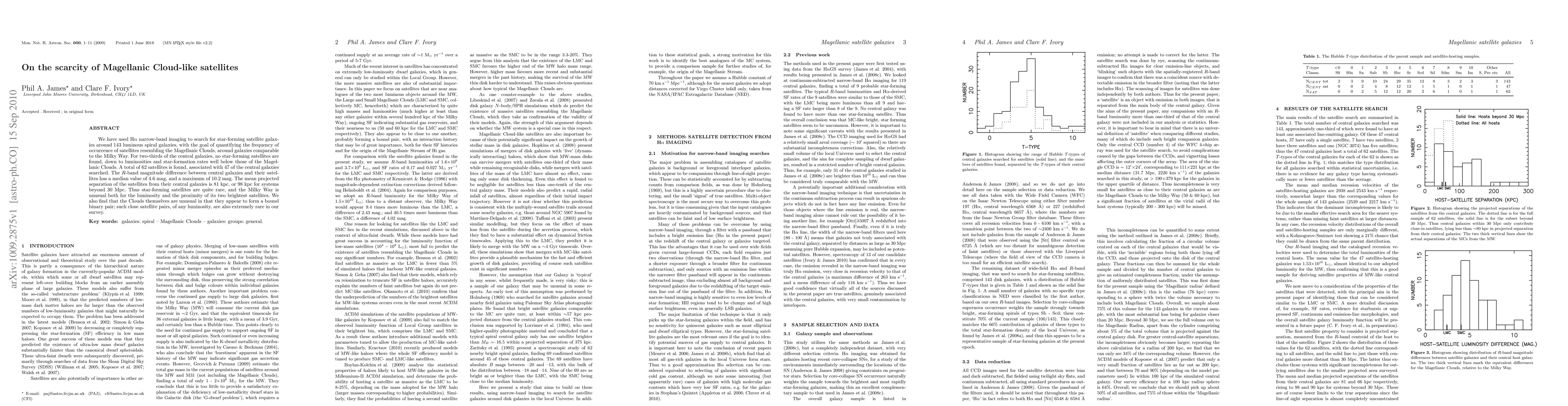 We have used H alpha narrow-band imaging to search for star-forming satellite galaxies around 143 luminous spiral galaxies, with the goal of quantifying the frequency of occurrence of satellites resembling the Magellanic Clouds, around galaxies comparable to the Milky Way. For two-thirds of the central galaxies, no star-forming satellites are found, down to luminosities and star-formation rates well below those of the Magellanic Clouds. A total of 62 satellites is found, associated with 47 of the central galaxies searched. The R-band magnitude difference between central galaxies and their satellites has a median value of 4.6 mag, and a maximum of 10.2 mag. The mean projected separation of the satellites from their central galaxies is 81 kpc, or 98 kpc for systems beyond 30 Mpc. Thus star-forming satellites are quite rare, and the Milky Way is unusual both for the luminosity and the proximity of its two brightest satellites. We also find that the Clouds themselves are unusual in that they appear to form a bound binary pair; such close satellite pairs, of any luminosity, are also extremely rare in our survey.