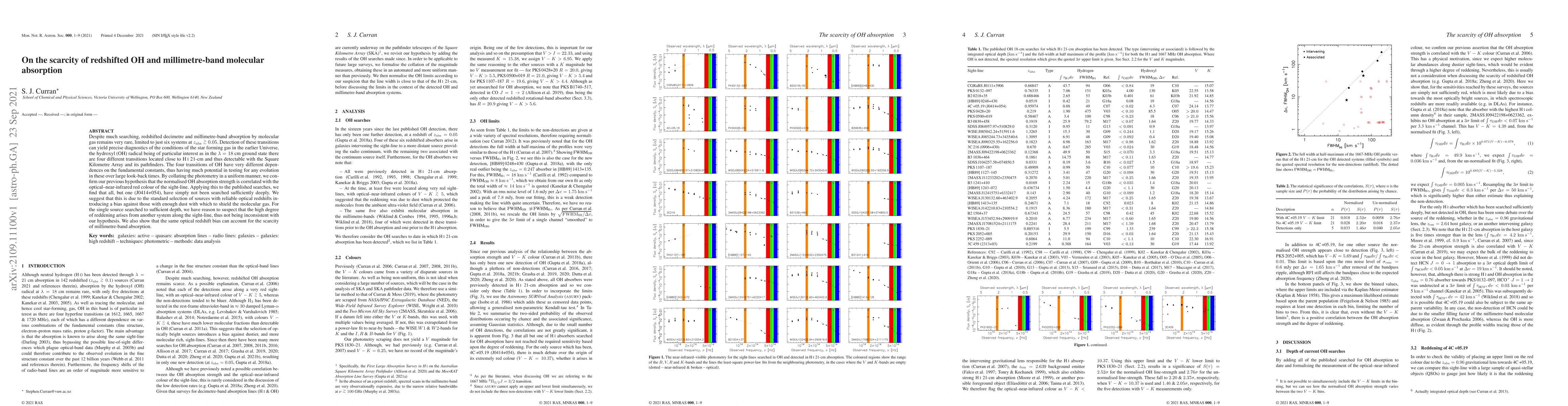 Despite much searching, redshifted decimetre and millimetre-band absorption by molecular gas remains very rare, limited to just six systems at z > 0.05. Detection of these transitions can yield precise diagnostics of the conditions of the star forming gas in the earlier Universe, the hydroxyl (OH) radical being of particular interest as in the 18-cm ground state there are four different transitions located close to HI 21-cm and thus detectable with the Square Kilometre Array and its pathfinders. The four transitions of OH have very different dependences on the fundamental constants, thus having much potential in testing for any evolution in these over large look-back times. By collating the photometry in a uniform manner, we confirm our previous hypothesis that the normalised OH absorption strength is correlated with the optical--near-infrared red colour of the sight-line. Applying this to the published searches, we find that all, but one (J0414+054), have simply not been searched sufficiently deeply. We suggest that this is due to the standard selection of sources with reliable optical redshifts introducing a bias against those with enough dust with which to shield the molecular gas. For the single source searched to sufficient depth, we have reason to suspect that the high degree of reddening arises from another system along the sight-line, thus not being inconsistent with our hypothesis. We also show that the same optical redshift bias can account for the scarcity of millimetre-band absorption.