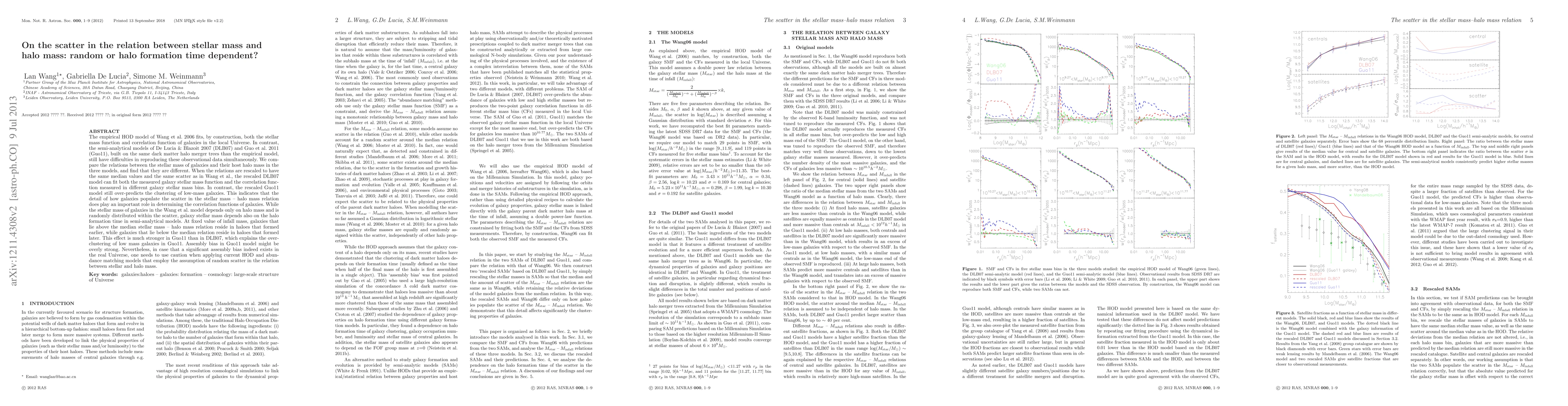 This paper investigates the scatter in the stellar mass-halo mass relation in three galaxy formation models, finding that semi-analytical models show a dependency on halo formation time, while the empirical HOD model assumes random scatter. The study highlights that the details of galaxy assembly history significantly impact galaxy clustering.