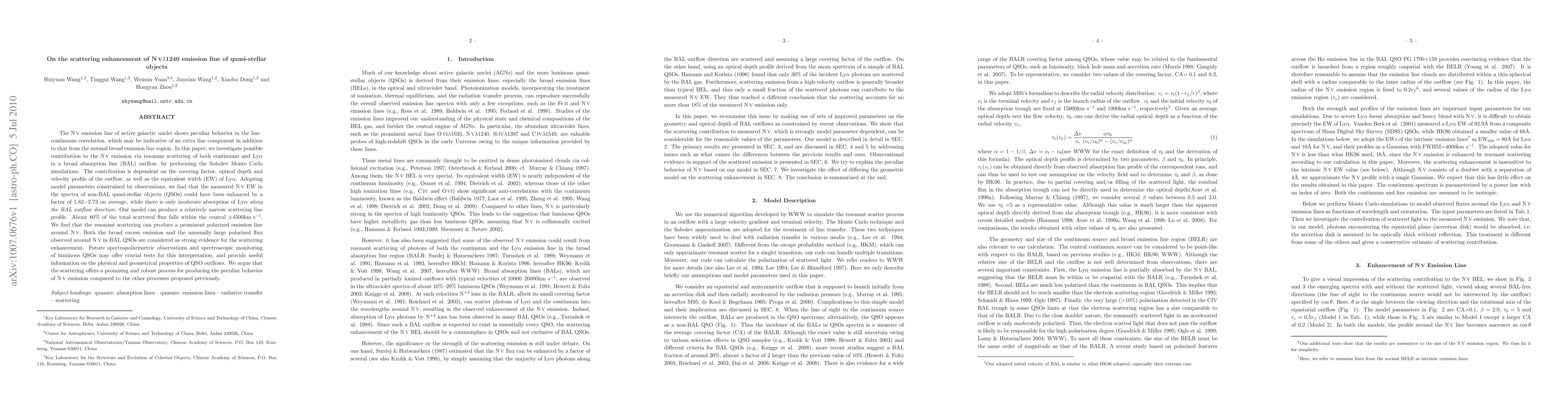 The Nv emission line of active galactic nuclei shows peculiar behavior in the line--continuum correlation, which may be indicative of an extra line component in addition to that from the normal broad emission line region. In this paper, we investigate possible contribution to the Nv emission via resonant scattering of both continuum and Ly alpha in a broad absorption line (BAL) outflow, by performing the Sobolev Monte Carlo simulations. The contribution is dependent on the covering factor, optical depth and velocity profile of the outflow, as well as the equivalent width (EW) of Ly alpha. Adopting model parameters constrained by observations, we find that the measured Nv EW in the spectra of non-BAL quasi-stellar objects (QSOs) could have been enhanced by a factor of 1.82~2.73 on average, while there is only moderate absorption of Ly alpha along the BAL outflow direction. Our model can produce a relatively narrow scattering line profile. About 80% of the total scattered flux falls within the central +-4500km/s. We find that the resonant scattering can produce a prominent polarized emission line around Nv. Both the broad excess emission and the unusually large polarized flux observed around Nv in BAL QSOs are considered as strong evidence for the scattering enhancement. Future spectropolarimetric observations and spectroscopic monitoring of luminous QSOs may offer crucial tests for this interpretation, and provide useful information on the physical and geometrical properties of QSO outflows. We argue that the scattering offers a promising and robust process for producing the peculiar behavior of Nv emission compared to the other processes proposed previously.