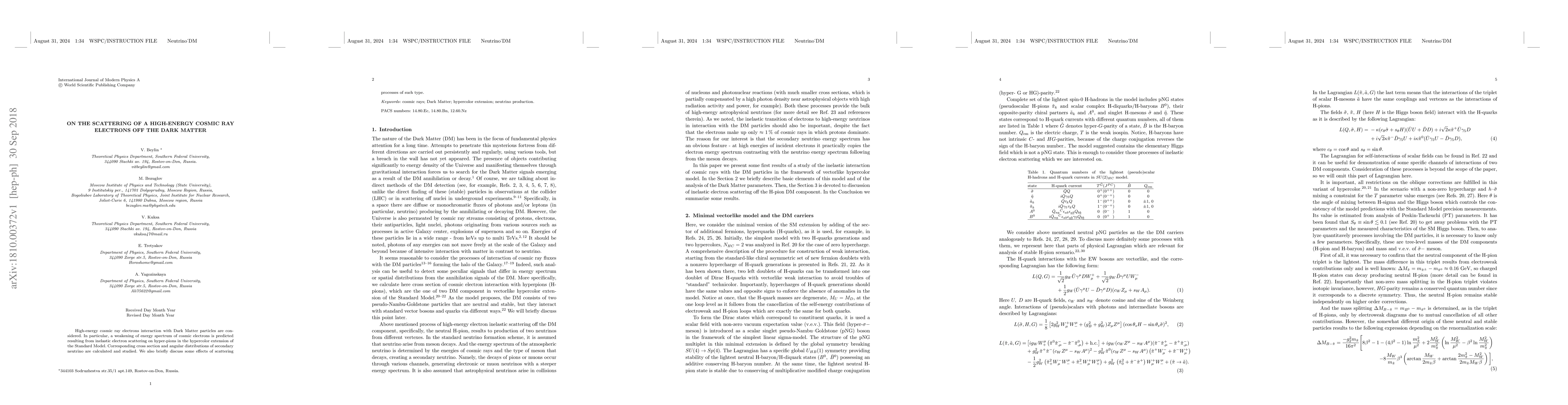 High-energy cosmic ray electrons interaction with Dark Matter particles are considered. In particular, a weakening of energy spectrum of cosmic electrons is predicted resulting from inelastic electron scattering on hyper-pions in the hypercolor extension of the Standard Model. Corresponding cross section and angular distributions of secondary neutrino are calculated and studied. We also briefly discuss some effects of scattering processes of such type.