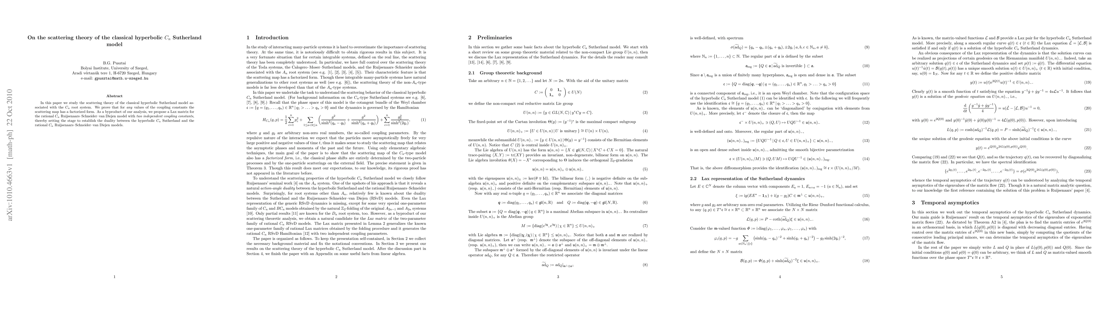This paper investigates the scattering theory of the classical hyperbolic Sutherland model, proving that the scattering map factorizes regardless of the coupling constants. Additionally, it proposes a Lax matrix for the rational C(n) Ruijsenaars-Schneider-van Diejen model, paving the way for establishing duality between the two models.