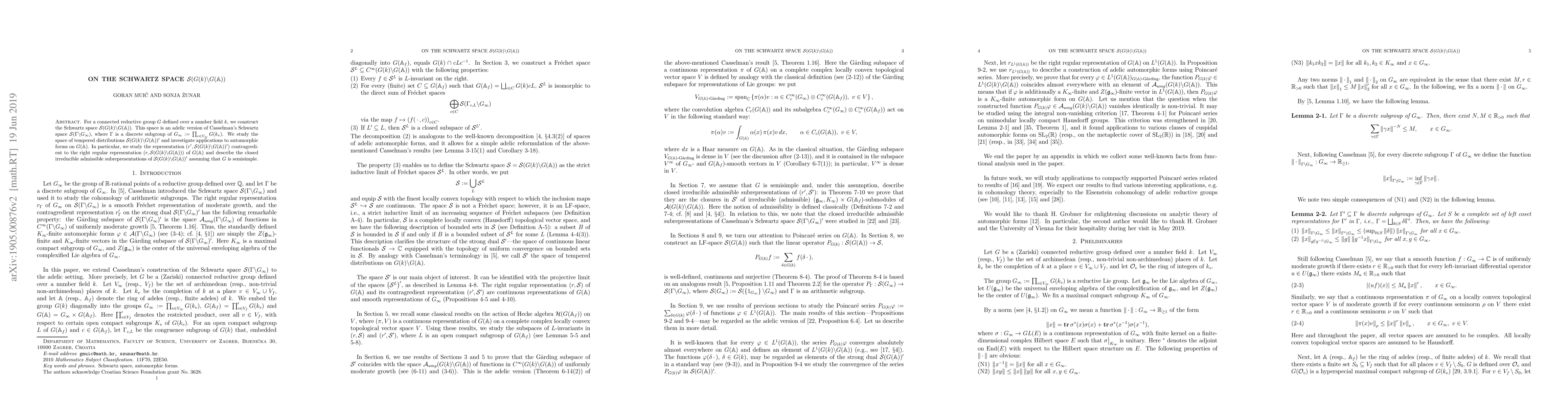 For a connected reductive group $ G $ defined over a number field $ k $, we construct the Schwartz space $ \mathcal{S}(G(k)\backslash G(\mathbb{A})) $. This space is an adelic version of Casselman's Schwartz space $ \mathcal{S}(\Gamma\backslash G_\infty) $, where $ \Gamma $ is a discrete subgroup of $ G_\infty:=\prod_{v\in V_\infty}G(k_v) $. We study the space of tempered distributions $ \mathcal{S}(G(k)\backslash G(\mathbb A))' $ and investigate applications to automorphic forms on $ G(\mathbb A) $. In particular, we study the representation $ \left(r',\mathcal{S}(G(k)\backslash G(\mathbb{A}))'\right) $ contragredient to the right regular representation $ (r,\mathcal{S}(G(k)\backslash G(\mathbb{A}))) $ of $ G(\mathbb{A}) $ and describe the closed irreducible admissible subrepresentations of $ \mathcal{S}(G(k)\backslash G(\mathbb{A}))' $ assuming that $ G $ is semisimple.