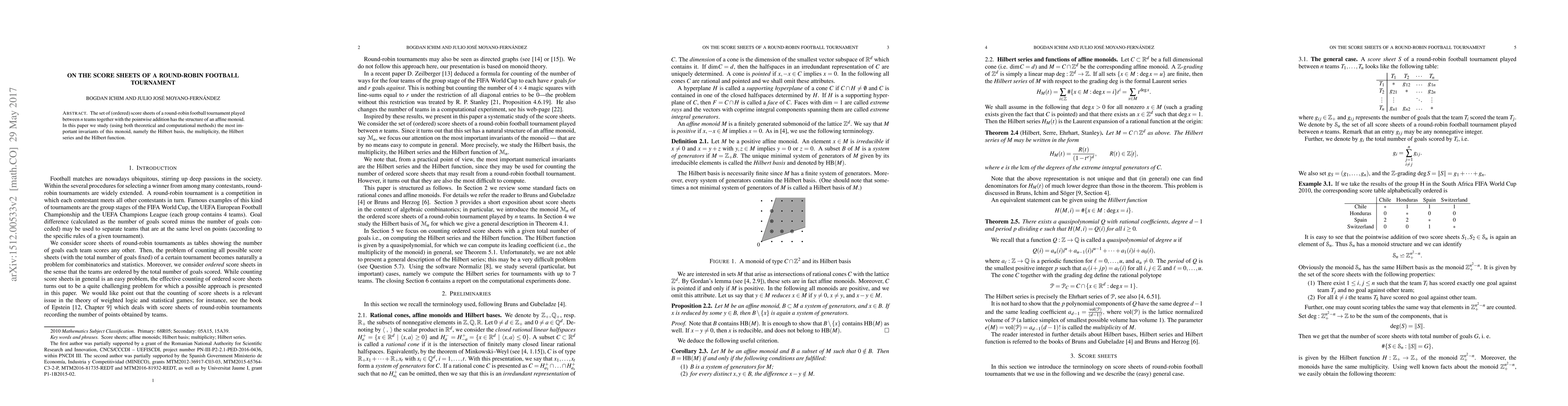 This paper explores the affine monoid structure of ordered score sheets from a round-robin football tournament, focusing on invariants such as the Hilbert basis, multiplicity, Hilbert series, and Hilbert function through theoretical and computational methods.