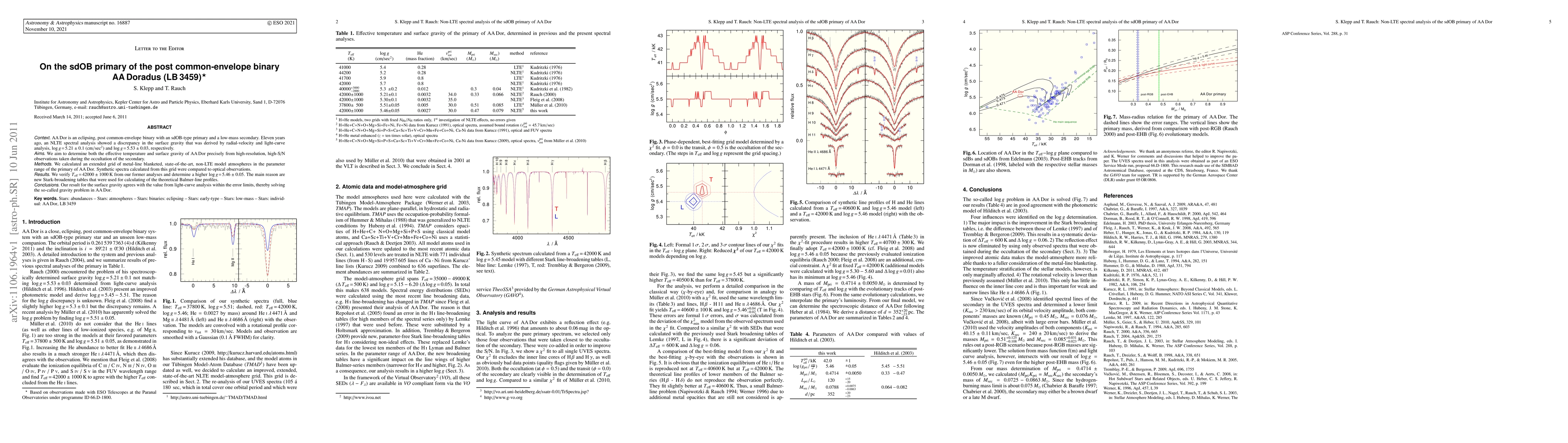 AA Dor is an eclipsing, post common-envelope binary with an sdOB-type primary and a low-mass secondary. Eleven years ago, an NLTE spectral analysis showed a discrepancy in the surface gravity that was derived by radial-velocity and light-curve analysis, log g = 5.21 +/- 0.1 (cm/sec^2) and log g = 5.53 +/- 0.03, respectively. We aim to determine both the effective temperature and surface gravity of AA Dor precisely from high-resolution, high-S/N observations taken during the occultation of the secondary. We calculated an extended grid of metal-line blanketed, state-of-the-art, non-LTE model atmospheres in the parameter range of the primary of AA Dor. Synthetic spectra calculated from this grid were compared to optical observations. We verify Teff = 42000 +/- 1000 K from our former analyses and determine a higher log g = 5.46 +/- 0.05. The main reason are new Stark-broadening tables that were used for calculating of the theoretical Balmer-line profiles. Our result for the surface gravity agrees with the value from light-curve analysis within the error limits, thereby solving the so-called gravity problem in AA Dor.