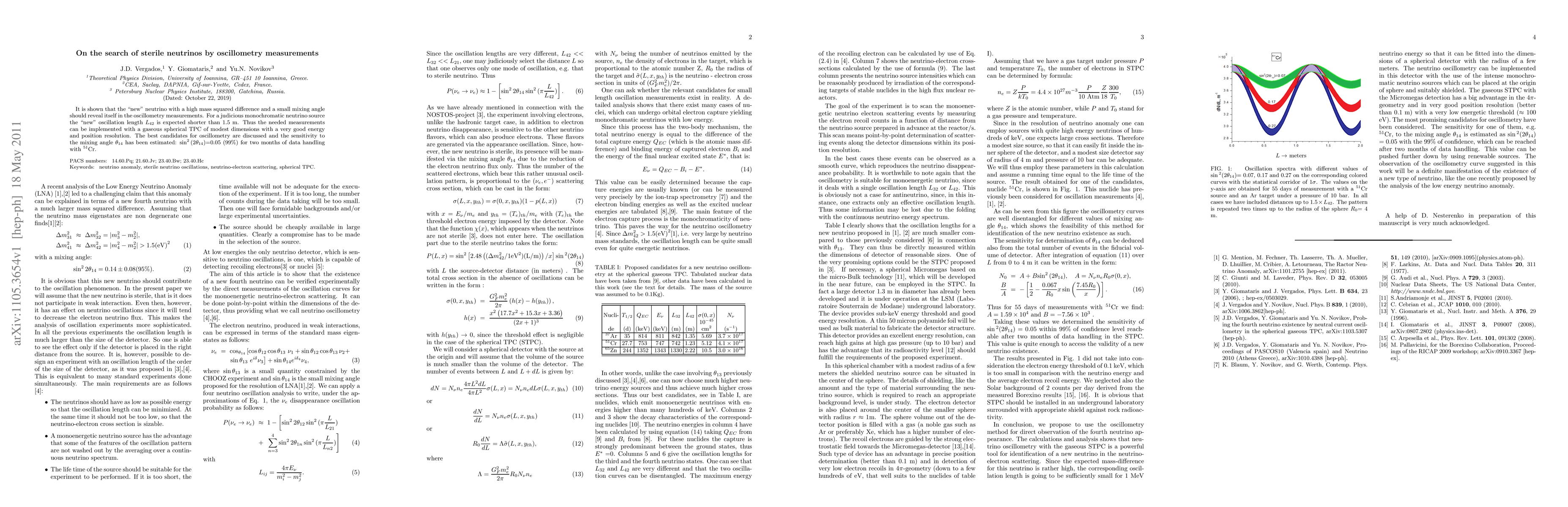 It is shown that the "new" neutrino with a high mass squared difference and a small mixing angle should reveal itself in the oscillometry measurements. For a judicious monochromatic neutrino source the "new" oscillation length $L_{42}$ is expected shorter than 1.5 m. Thus the needed measurements can be implemented with a gaseous spherical TPC of modest dimensions with a very good energy and position resolution. The best candidates for oscillometry are discussed and the sensitivity to the mixing angle $\theta_{14}$ has been estimated: $\sin^2{(2\theta_{14})}$=0.05 (99{%}) for two months of data handling with $^{51}$Cr.