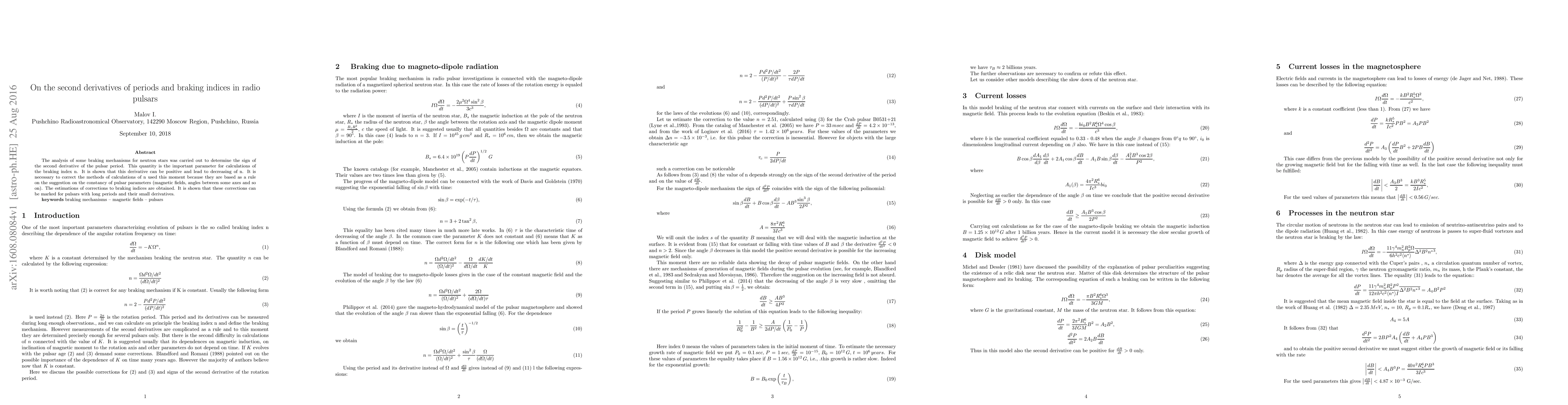 This paper investigates braking mechanisms in neutron stars, determining the sign of the second derivative of pulsar periods, which is crucial for calculating braking indices. It finds that this derivative can be positive, leading to a decrease in braking indices, necessitating corrections to current methods that assume constant pulsar parameters.