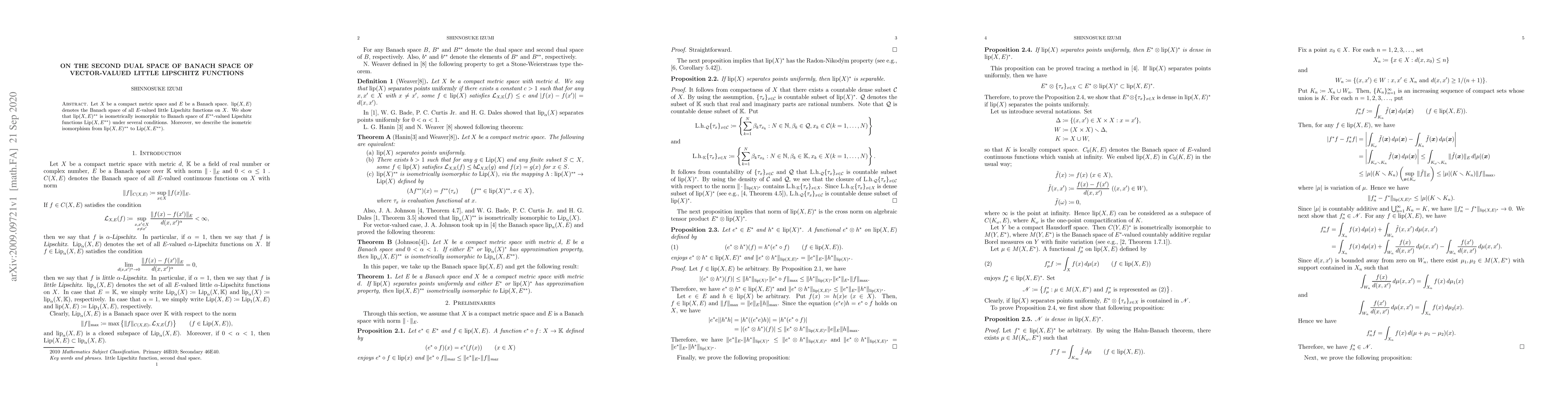 This paper demonstrates that the second dual of the Banach space \(\lip (X, E)\) of \(E\)-valued little Lipschitz functions on a compact metric space \(X\) is isometrically isomorphic to the Banach space \(\Lip(X, E^{**})\) of \(E^{**}\)-valued Lipschitz functions, under certain conditions. It also provides a description of the isometric isomorphism.