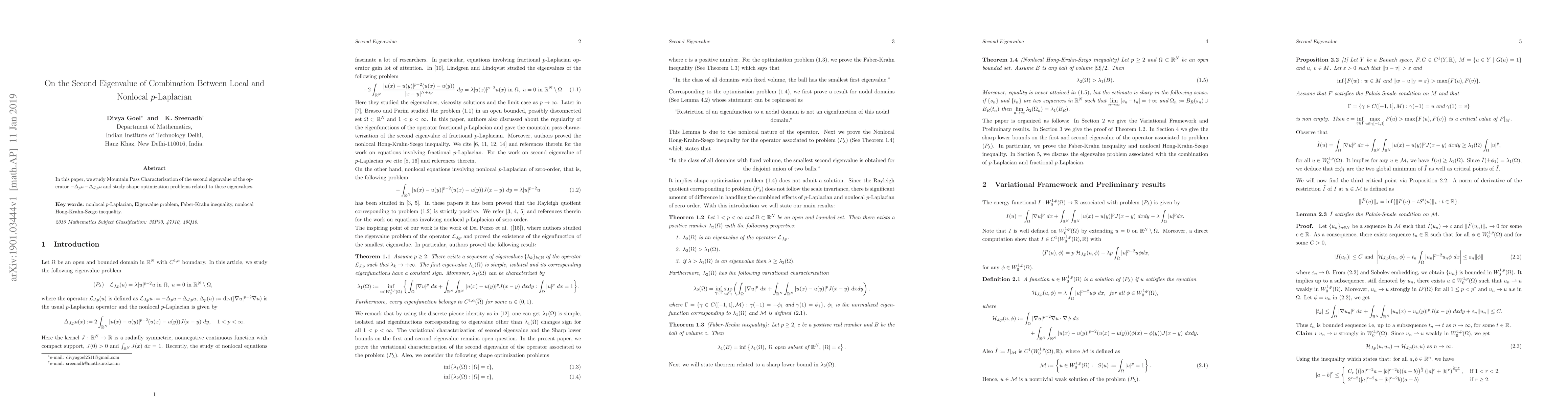 This paper investigates the Mountain Pass Characterization of the second eigenvalue for an operator combining local and nonlocal $p$-Laplacian operators, with implications for shape optimization problems.