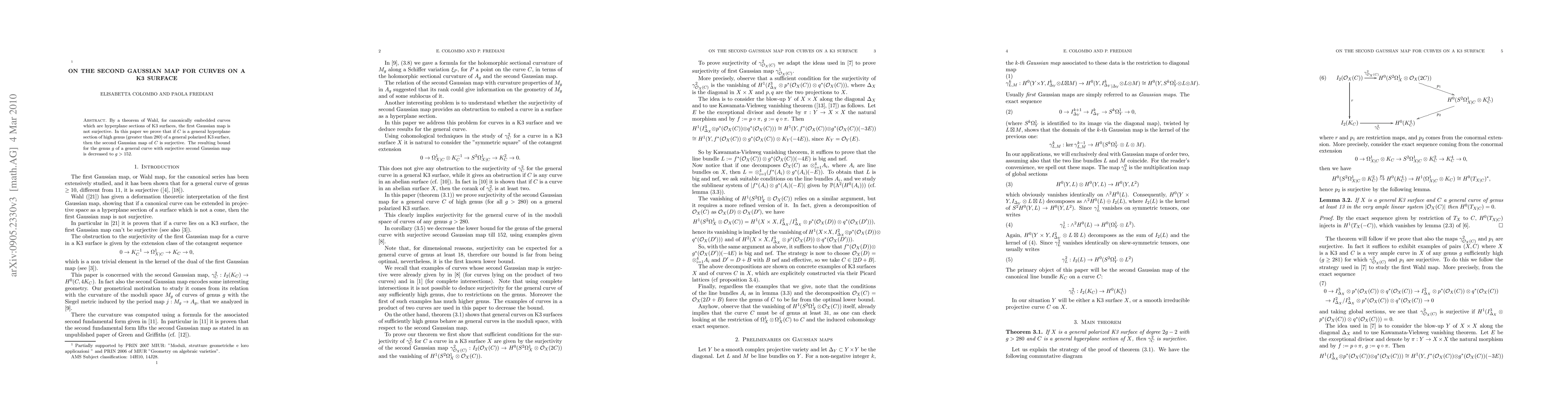 By a theorem of Wahl, for canonically embedded curves which are hyperplane sections of K3 surfaces, the first gaussian map is not surjective. In this paper we prove that if C is a general hyperplane section of high genus (greater than 280) of a general polarized K3 surface, then the second gaussian map of C is surjective. The resulting bound for the genus g of a general curve with surjective second gaussian map is decreased to g >152.