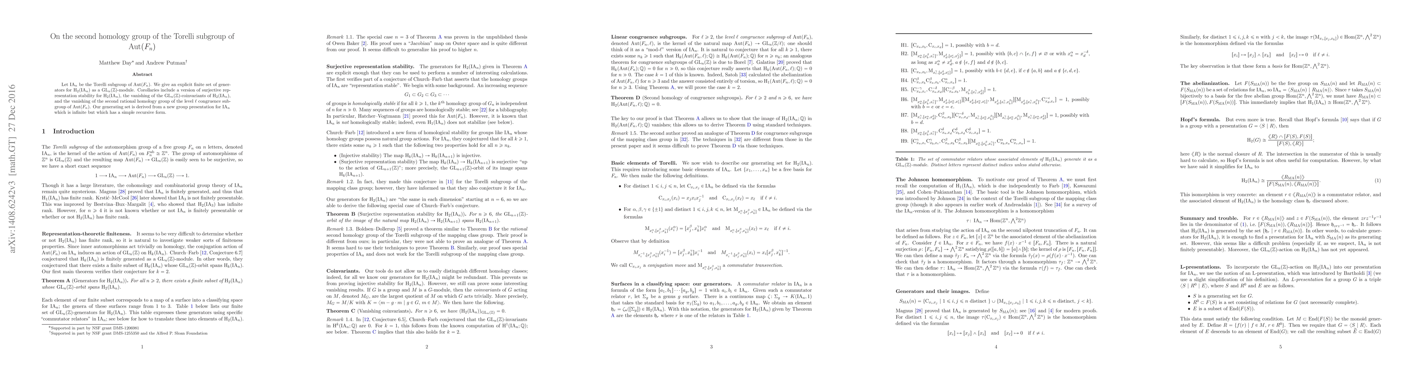 This paper presents an explicit finite generating set for the second homology group H_2(IA_n) as a GL_n(Z)-module, derived from a recursive infinite group presentation for the Torelli subgroup of Aut(F_n). It also establishes representation stability, vanishing of GL_n(Z)-coinvariants, and the vanishing of the second rational homology group for level l congruence subgroups.