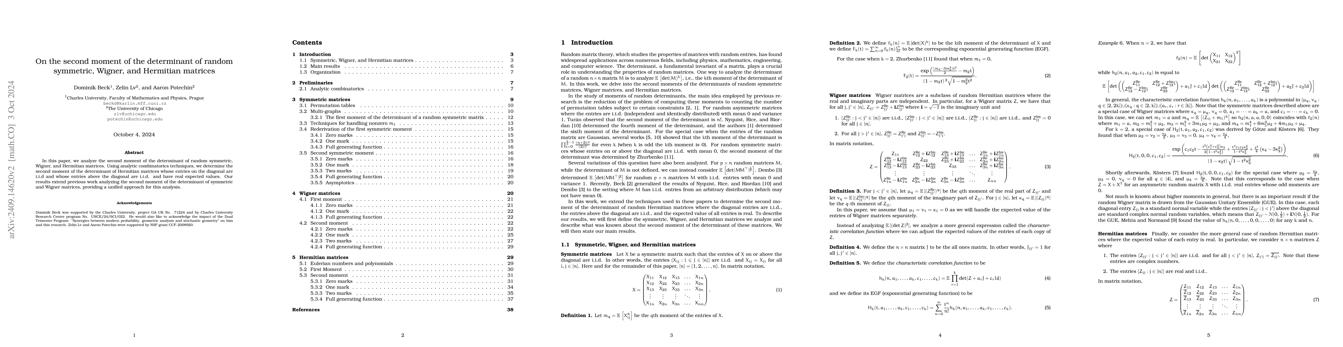This paper investigates the second moment of the determinant for random symmetric, Wigner, and Hermitian matrices, utilizing analytic combinatorics to derive results for Hermitian matrices with independent and identically distributed diagonal and above-diagonal entries. The study extends prior analyses, offering a unified approach.