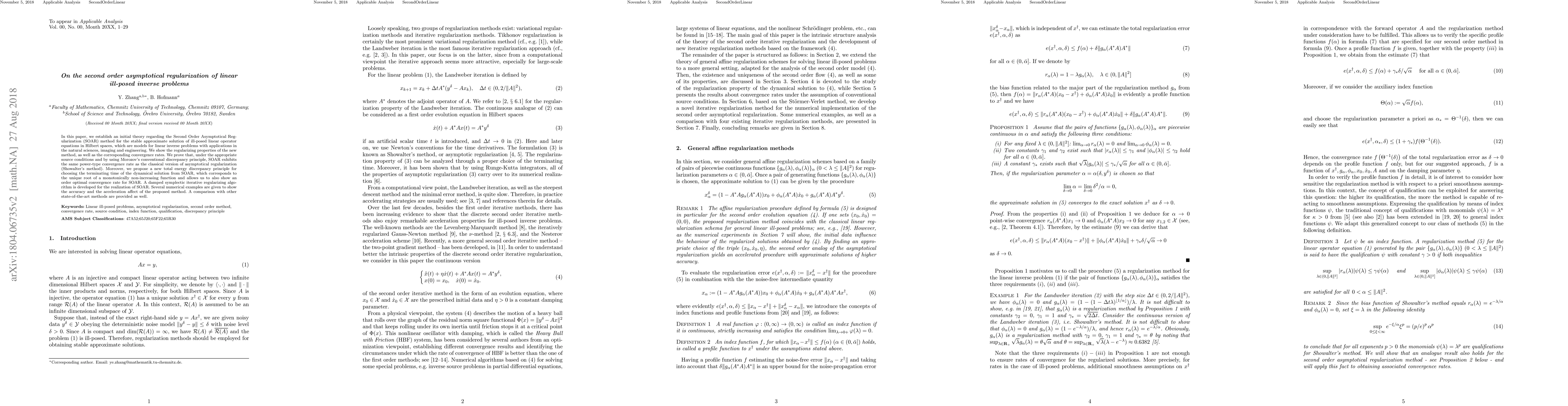 This paper introduces the Second Order Asymptotical Regularization (SOAR) method for solving ill-posed linear inverse problems, demonstrating its convergence rate and proposing a new total energy discrepancy principle for optimal termination. Numerical examples and comparisons show SOAR's accuracy and efficiency.