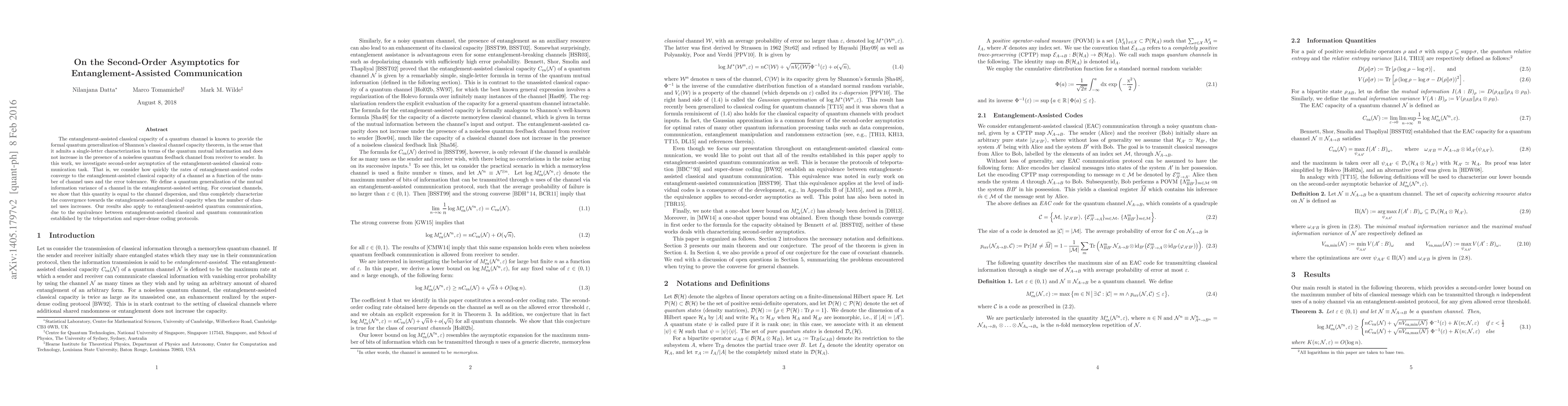This paper investigates the second-order asymptotics of entanglement-assisted classical communication, defining a quantum mutual information variance that characterizes the convergence rate to the entanglement-assisted capacity. It shows that for covariant channels, this variance equals the channel dispersion, providing a complete characterization of the convergence as channel uses increase.