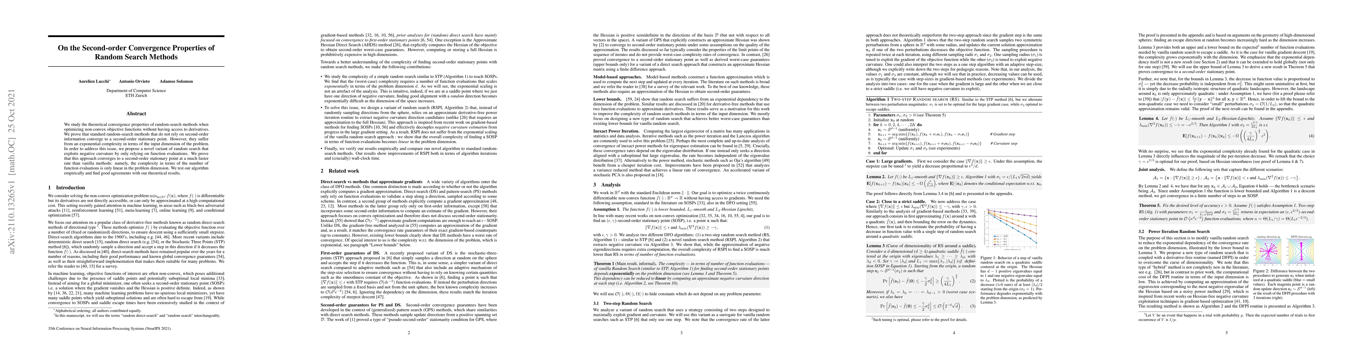 We study the theoretical convergence properties of random-search methods when optimizing non-convex objective functions without having access to derivatives. We prove that standard random-search methods that do not rely on second-order information converge to a second-order stationary point. However, they suffer from an exponential complexity in terms of the input dimension of the problem. In order to address this issue, we propose a novel variant of random search that exploits negative curvature by only relying on function evaluations. We prove that this approach converges to a second-order stationary point at a much faster rate than vanilla methods: namely, the complexity in terms of the number of function evaluations is only linear in the problem dimension. We test our algorithm empirically and find good agreements with our theoretical results.