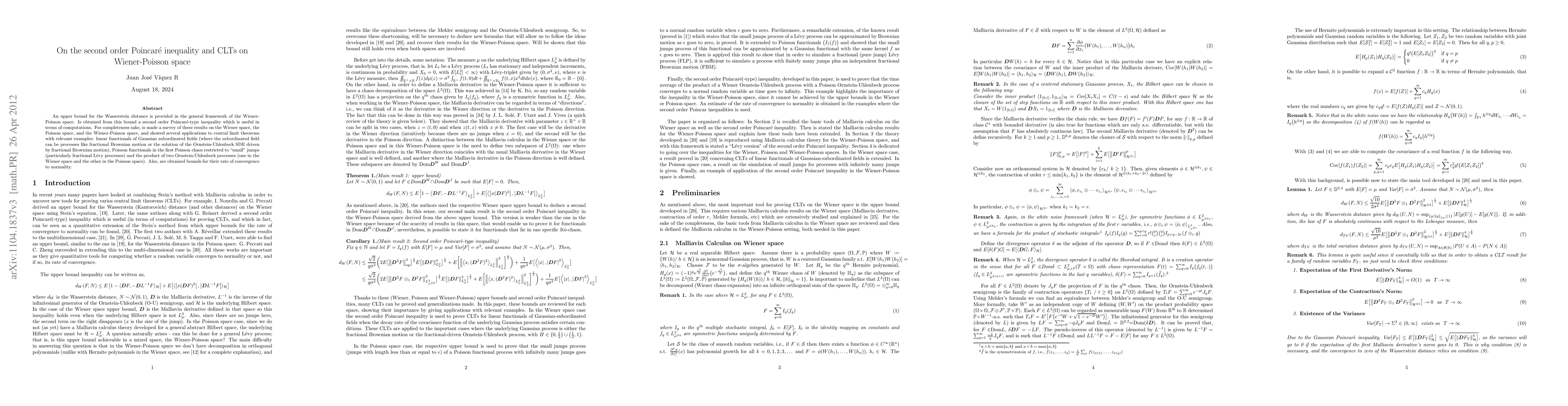 An upper bound for the Wasserstein distance is provided in the general framework of the Wiener-Poisson space. Is obtained from this bound a second order Poincar\'e-type inequality which is useful in terms of computations. For completeness sake, is made a survey of these results on the Wiener space, the Poisson space, and the Wiener-Poisson space, and showed several applications to central limit theorems with relevant examples: linear functionals of Gaussian subordinated field (where the subordinated field can be processes like fractional Brownian motion or the solution of the Ornstein-Uhlenbeck SDE driven by fractional Brownian motion), Poisson functionals in the first Poisson chaos restricted to \small" jumps (particularly fractional L\'evy processes) and the product of two Ornstein-Uhlenbeck processes (one in the Wiener space and the other in the Poisson space). Also, are obtained bounds for their rate of convergence to normality.