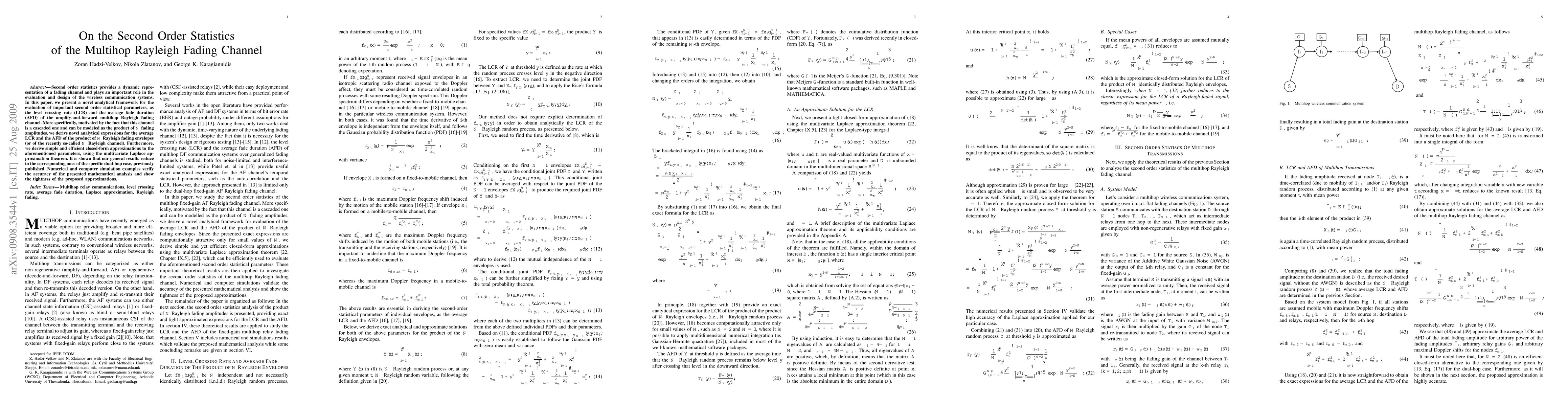 This paper develops an analytical framework for evaluating second order statistics of multihop Rayleigh fading channels, deriving expressions for level crossing rate and average fade duration, and providing efficient approximations using the multivariate Laplace theorem. The results are validated through numerical simulations.