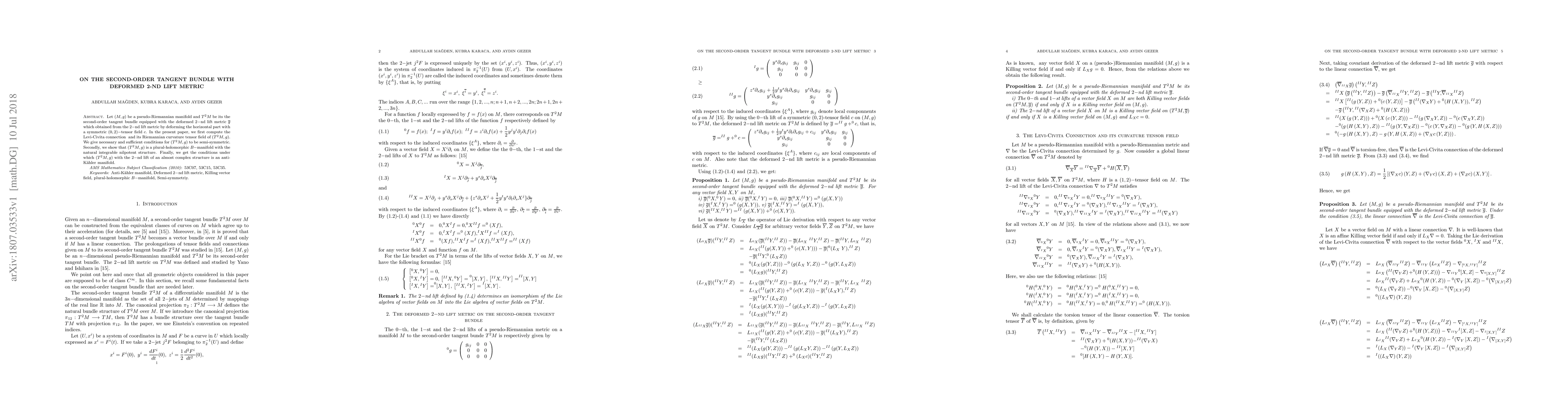 The paper investigates the properties of the second-order tangent bundle of a pseudo-Riemannian manifold with a deformed 2-nd lift metric, finding conditions for semi-symmetry, plural-holomorphic B-manifold structure, and anti-K"ahler manifold classification.