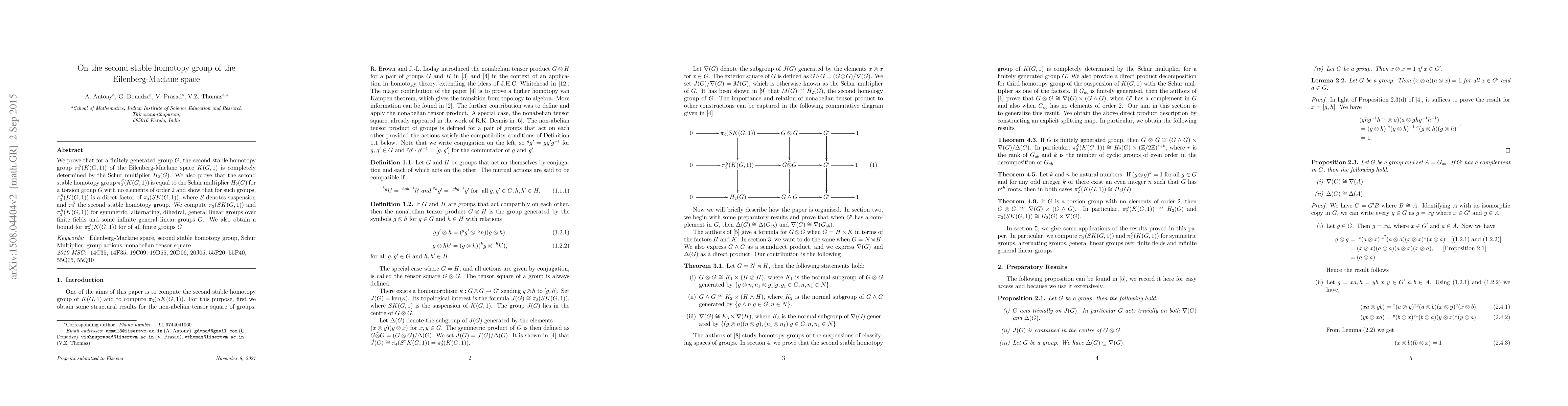 This paper demonstrates that the second stable homotopy group $\pi_2^S(K(G,1))$ of an Eilenberg-Maclane space is determined by the Schur multiplier $H_2(G)$ for finitely generated groups $G$. It further shows that for torsion groups $G$ without elements of order $2$, $\pi_2^S(K(G,1))$ equals $H_2(G)$ and is a direct factor of $\pi_3(SK(G,1))$.