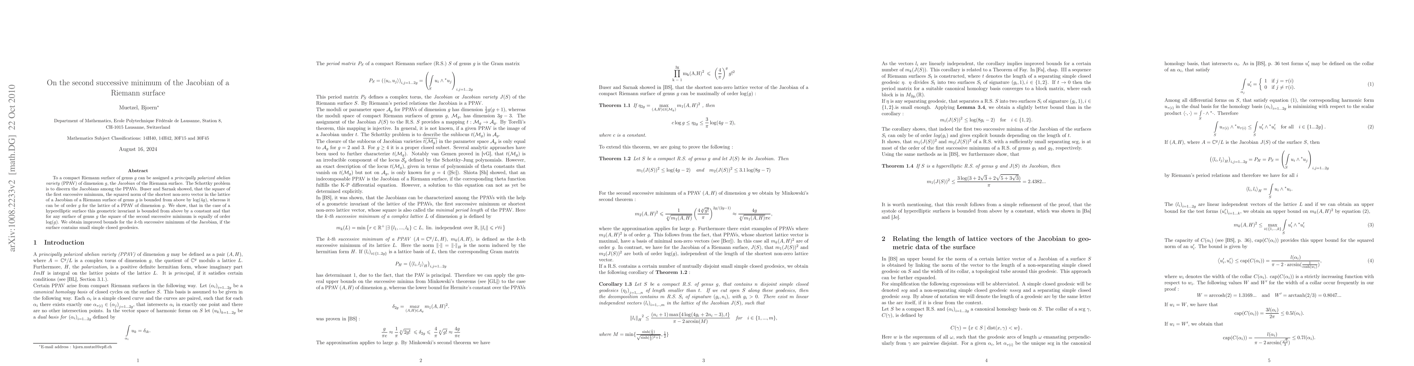 This paper investigates the second successive minimum of the Jacobian of a Riemann surface, showing that for hyperelliptic surfaces, this invariant is bounded, while for general genus g surfaces, it scales logarithmically with g. Improved bounds are also derived for the k-th successive minimum when small simple closed geodesics are present.