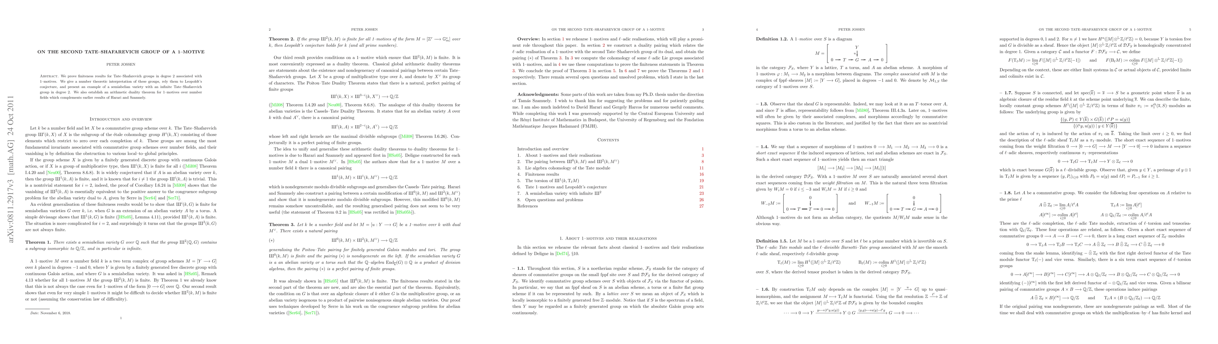 This paper proves finiteness results for degree 2 Tate-Shafarevich groups linked to 1-motives, connects them to Leopoldt's conjecture, and provides an example of a semiabelian variety with an infinite degree 2 Tate-Shafarevich group. It also establishes an arithmetic duality theorem for 1-motives over number fields.
