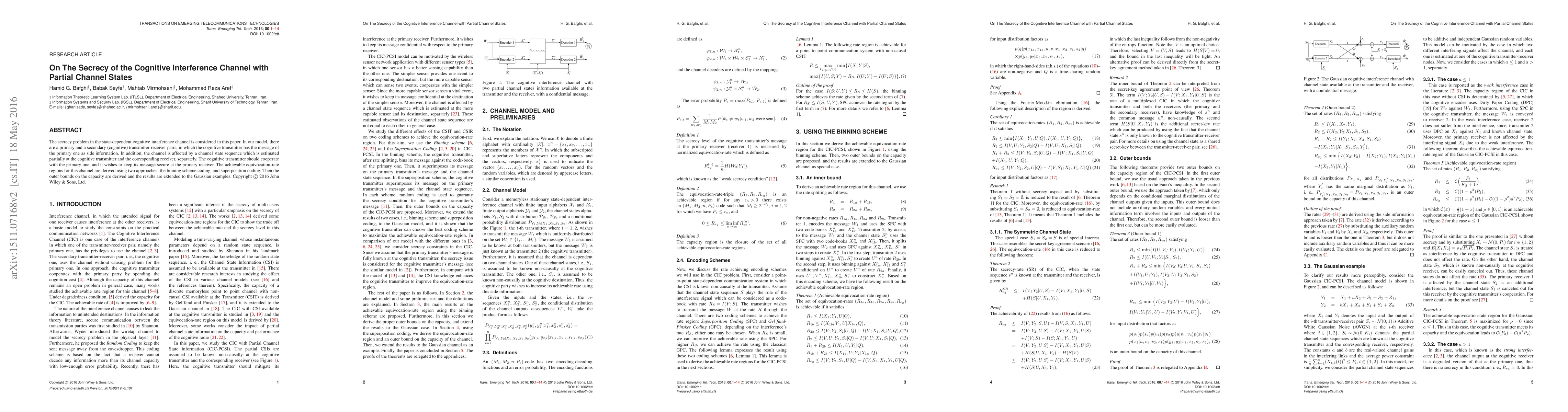 This paper investigates the secrecy of a cognitive interference channel where partial channel state information is available. It derives achievable equivocation-rate regions using binning and superposition coding, and proposes outer bounds on the capacity, extending the results to Gaussian examples.