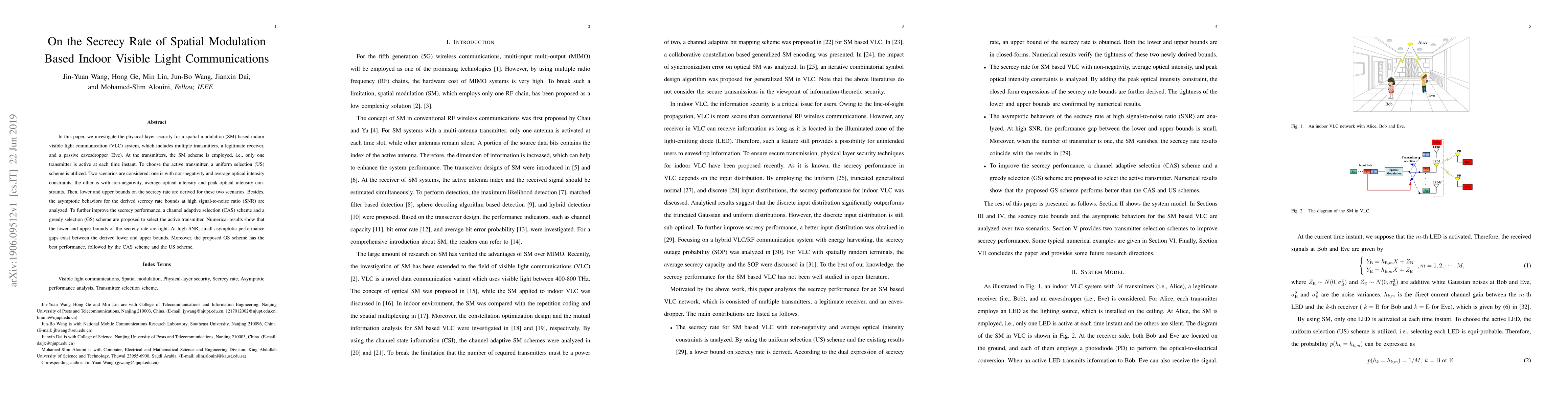 This paper investigates the physical-layer security in spatial modulation-based indoor visible light communication systems, deriving lower and upper bounds on the secrecy rate under different constraints and proposing adaptive selection schemes to improve performance. Numerical results show tight bounds and superior performance of the greedy selection scheme.