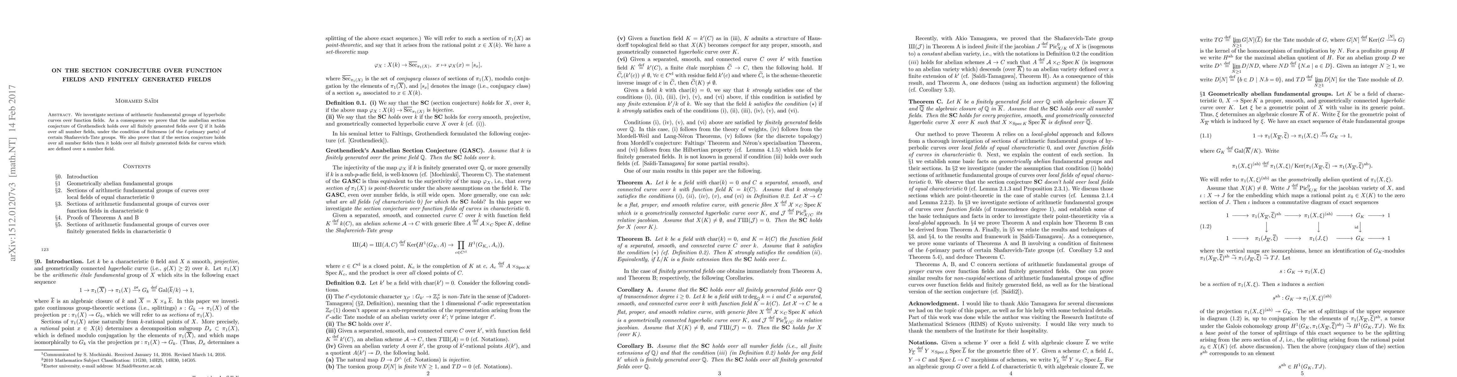 We investigate sections of arithmetic fundamental groups of hyperbolic curves over function fields. As a consequence we prove that the anabelian section conjecture of Grothendieck holds over all finitely generated fields over $\Bbb Q$ if it holds over all number fields, under the condition of finiteness (of the $\ell$-primary parts) of certain Shafarevich-Tate groups. We also prove that if the section conjecture holds over all number fields then it holds over all finitely generated fields for curves which are defined over a number field.