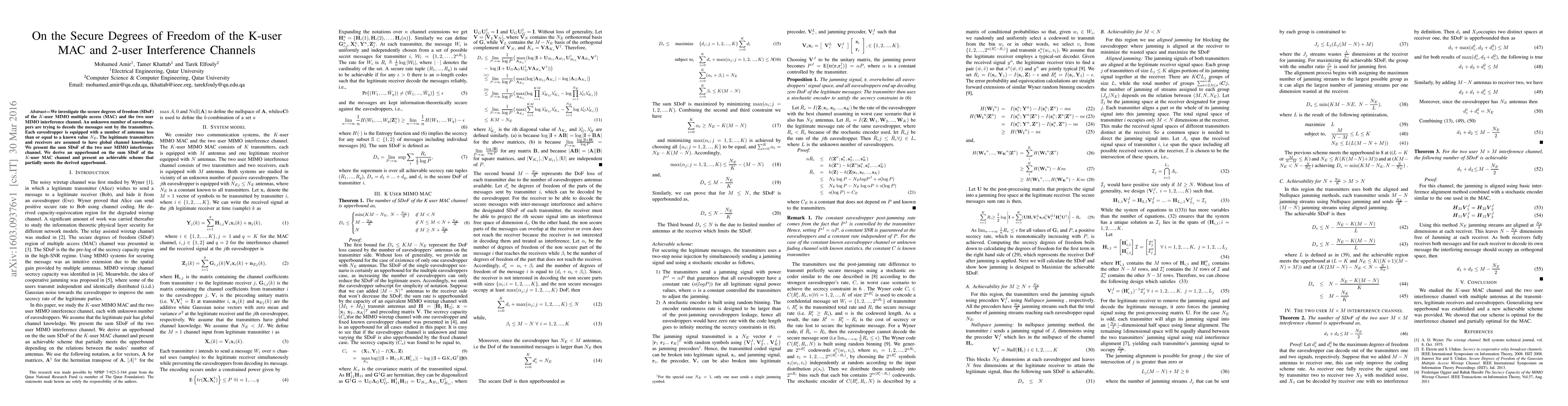 This paper explores the secure degrees of freedom (SDoF) for K-user MIMO MAC and 2-user MIMO interference channels with potential eavesdroppers. It presents an achievable scheme for the 2-user interference channel and derives an upperbound for the K-user MAC channel.