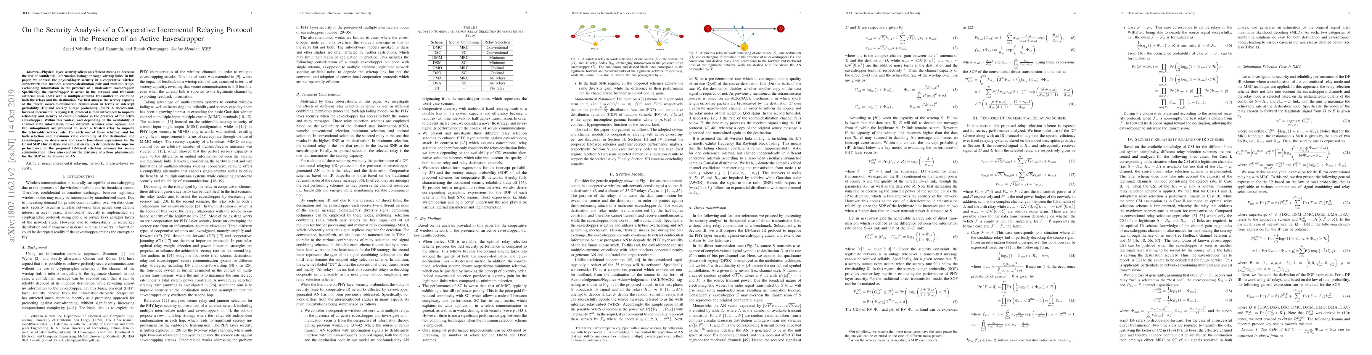 This paper investigates the security of a cooperative wireless subnetwork using an incremental relaying protocol against an active eavesdropper. It proposes three relay selection schemes to enhance secrecy rate, deriving closed-form expressions for intercept probability and secrecy outage probability, and demonstrating superior performance through analysis and simulation.