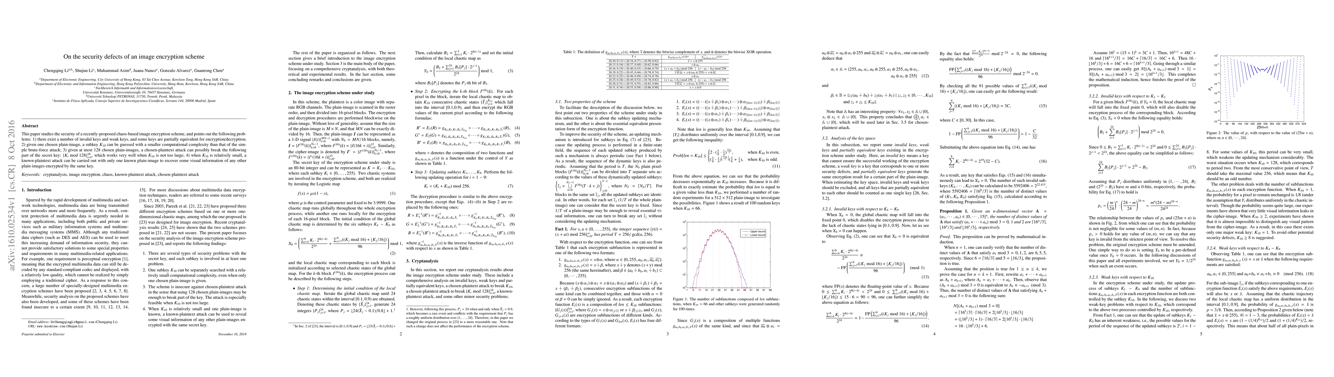 Researchers found several security defects in a recently-proposed image encryption scheme, including invalid keys, weak keys, and vulnerabilities to chosen-plaintext attacks.