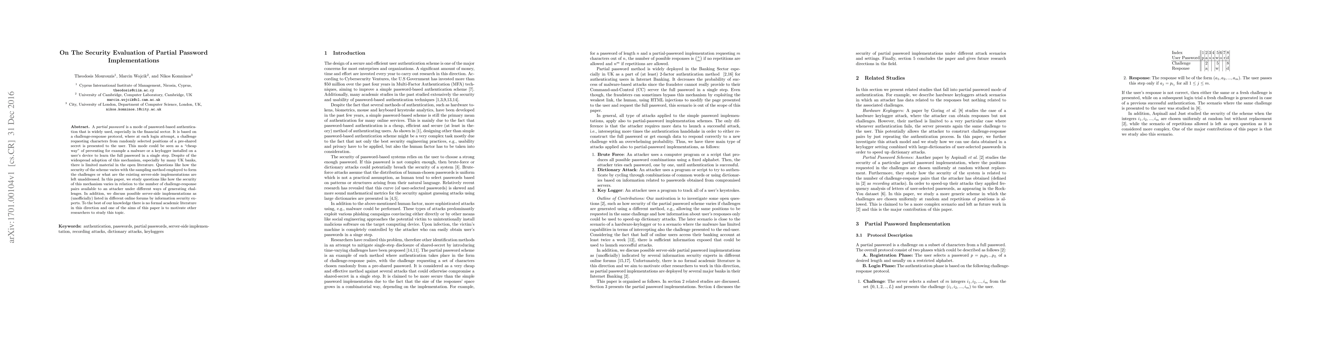 A partial password is a mode of password-based authentication that is widely used, especially in the financial sector. It is based on a challenge-response protocol, where at each login attempt, a challenge requesting characters from randomly selected positions of a pre-shared secret is presented to the user. This model could be seen as a cheap way of preventing for example a malware or a key-logger installed on a user's device to learn the full password in a single step. Despite of the widespread adoption of this mechanism, especially by many UK banks, there is limited material in the open literature. Questions like how the security of the scheme varies with the sampling method employed to form the challenges or what are the existing server-side implementations are left unaddressed. In this paper, we study questions like how the security of this mechanism varies in relation to the number of challenge-response pairs available to an attacker under different ways of generating challenges. In addition, we discuss possible server-side implementations as "unofficially" listed in different online forums by information security ex- perts. To the best of our knowledge there is no formal academic literature in this direction and one of the aims of this paper is to motivate other researchers to study this topic.