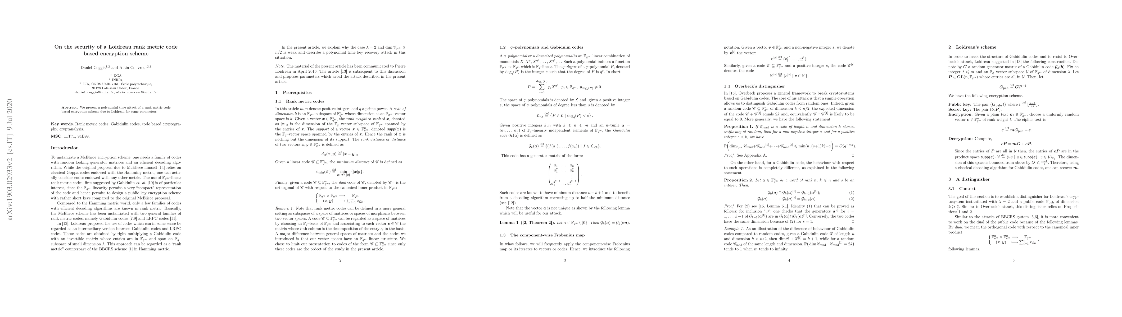 Summary: This paper demonstrates a polynomial time attack on Loidreau's rank metric code based encryption scheme, revealing vulnerabilities for specific parameter settings. The findings suggest potential weaknesses in the security of the encryption method under certain conditions.
