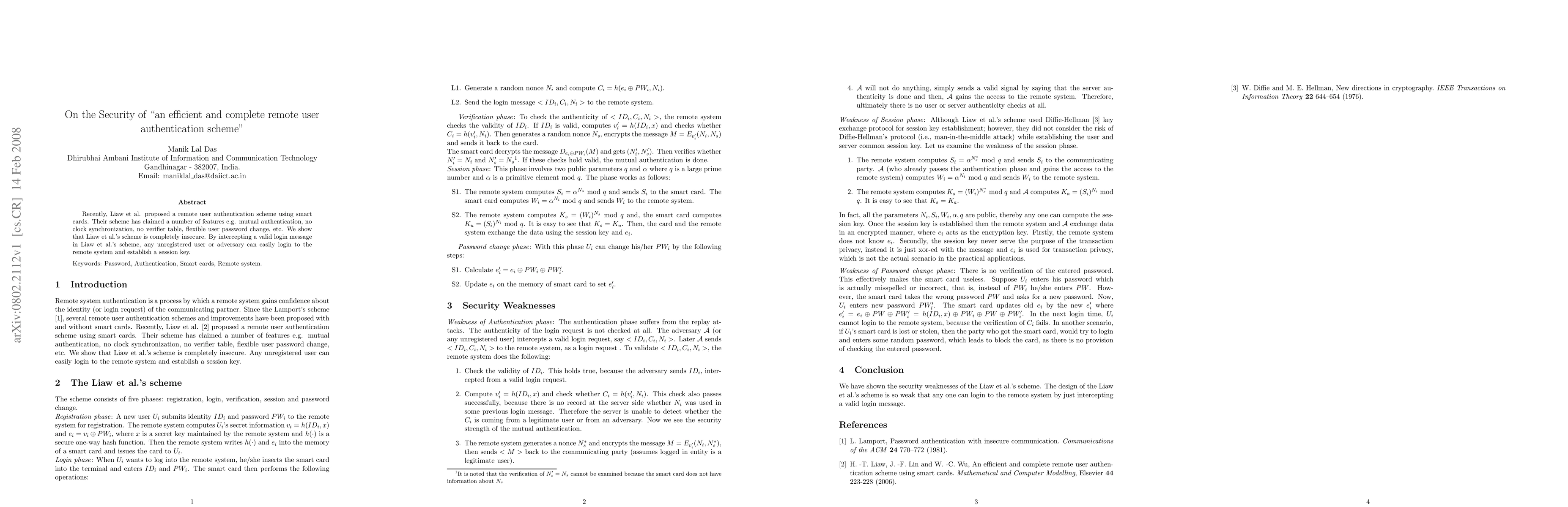 Recently, Liaw et al. proposed a remote user authentication scheme using smart cards. Their scheme has claimed a number of features e.g. mutual authentication, no clock synchronization, no verifier table, flexible user password change, etc. We show that Liaw et al.'s scheme is completely insecure. By intercepting a valid login message in Liaw et al.'s scheme, any unregistered user or adversary can easily login to the remote system and establish a session key.
