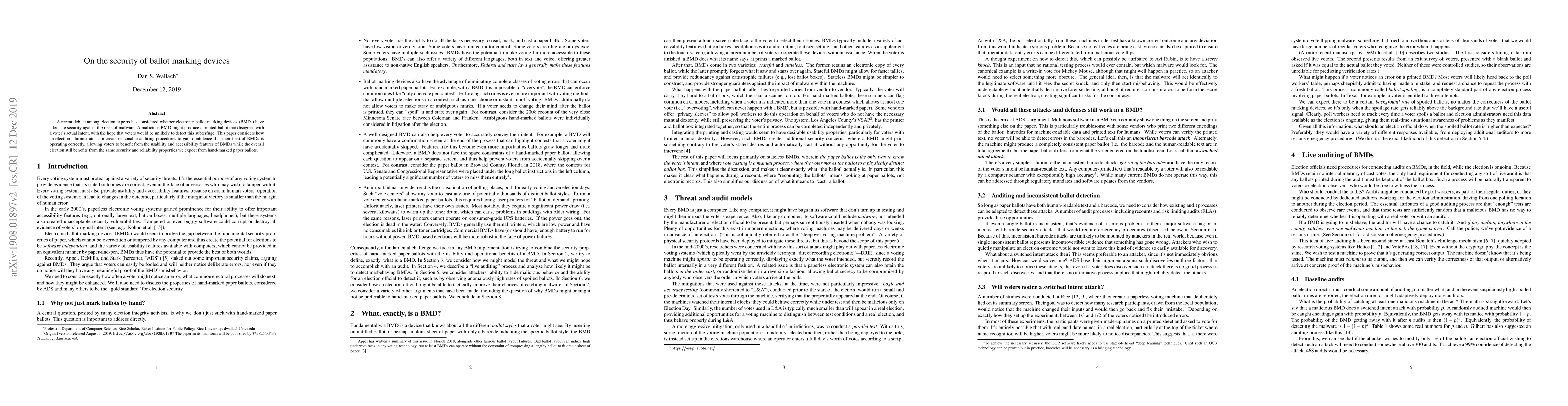 Researchers explored ways for election administrators to ensure the security of ballot marking devices, which can be vulnerable to malware, and proposed auditing procedures to gain confidence in their correct operation.