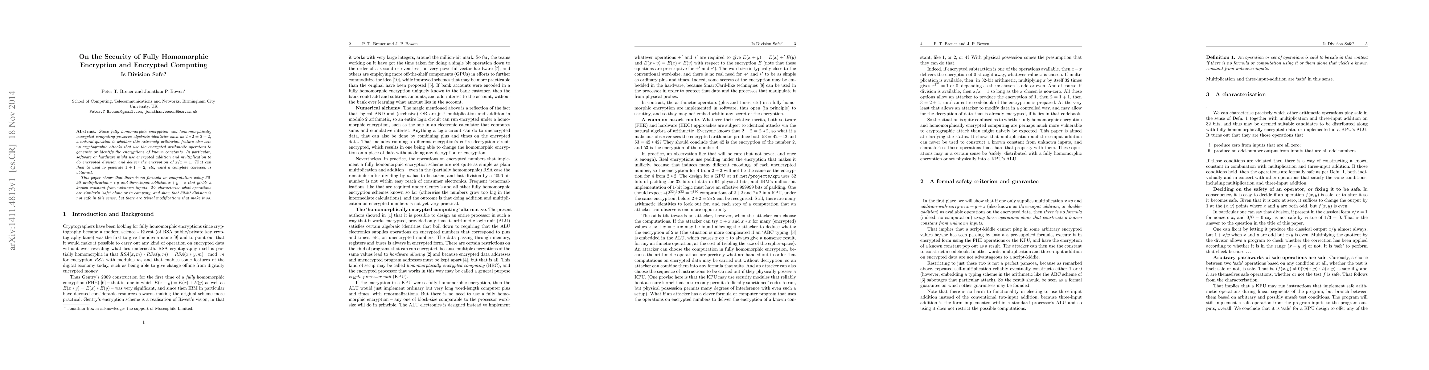 This paper investigates the security implications of fully homomorphic encryption (FHE) regarding arithmetic operations, particularly focusing on division. It concludes that while 32-bit division is not safe, simple modifications can render it secure, ensuring that no known constants can be derived from encrypted inputs.