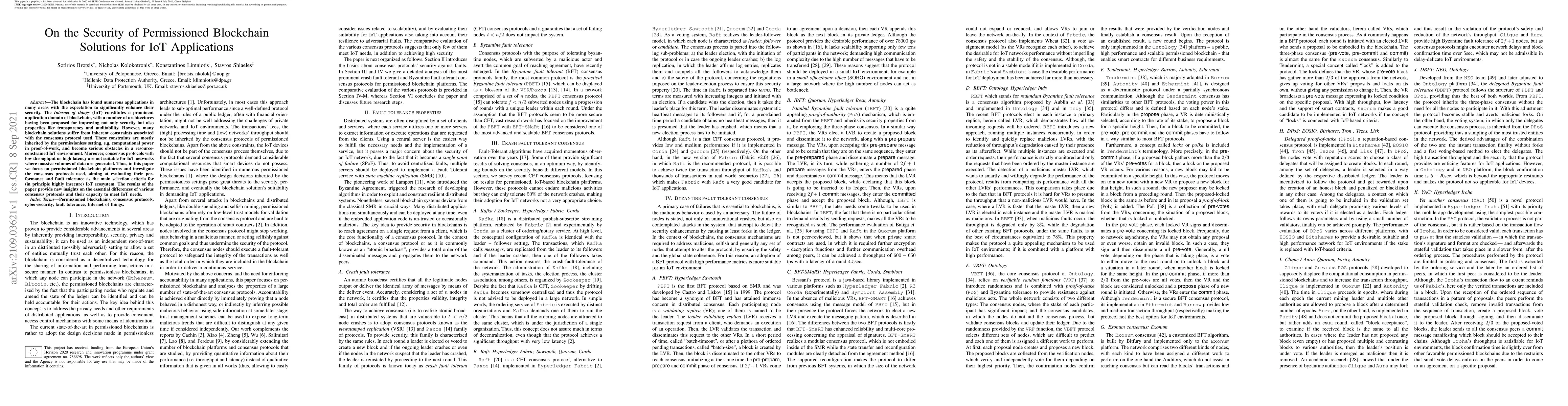 This paper evaluates the security and performance of permissioned blockchain solutions for IoT applications, focusing on consensus protocols to determine their suitability for resource-constrained environments. It highlights the limitations of permissionless blockchains and provides insights into how different consensus protocols can meet the high throughput and low latency requirements of IoT networks.
