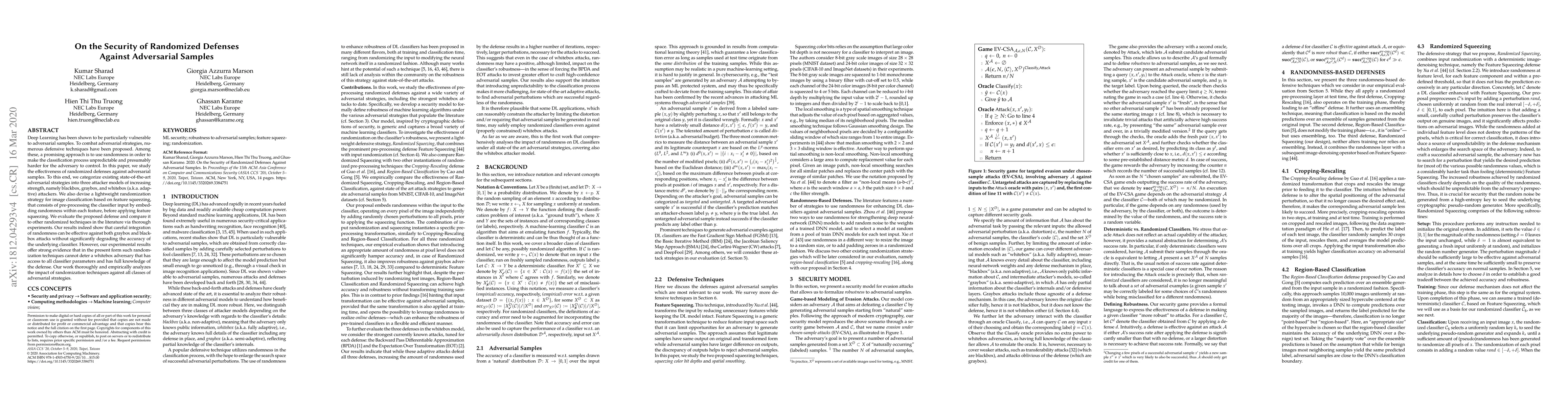 Deep Learning has been shown to be particularly vulnerable to adversarial samples. To combat adversarial strategies, numerous defensive techniques have been proposed. Among these, a promising approach is to use randomness in order to make the classification process unpredictable and presumably harder for the adversary to control. In this paper, we study the effectiveness of randomized defenses against adversarial samples. To this end, we categorize existing state-of-the-art adversarial strategies into three attacker models of increasing strength, namely blackbox, graybox, and whitebox (a.k.a.~adaptive) attackers. We also devise a lightweight randomization strategy for image classification based on feature squeezing, that consists of pre-processing the classifier input by embedding randomness within each feature, before applying feature squeezing. We evaluate the proposed defense and compare it to other randomized techniques in the literature via thorough experiments. Our results indeed show that careful integration of randomness can be effective against both graybox and blackbox attacks without significantly degrading the accuracy of the underlying classifier. However, our experimental results offer strong evidence that in the present form such randomization techniques cannot deter a whitebox adversary that has access to all classifier parameters and has full knowledge of the defense. Our work thoroughly and empirically analyzes the impact of randomization techniques against all classes of adversarial strategies.
