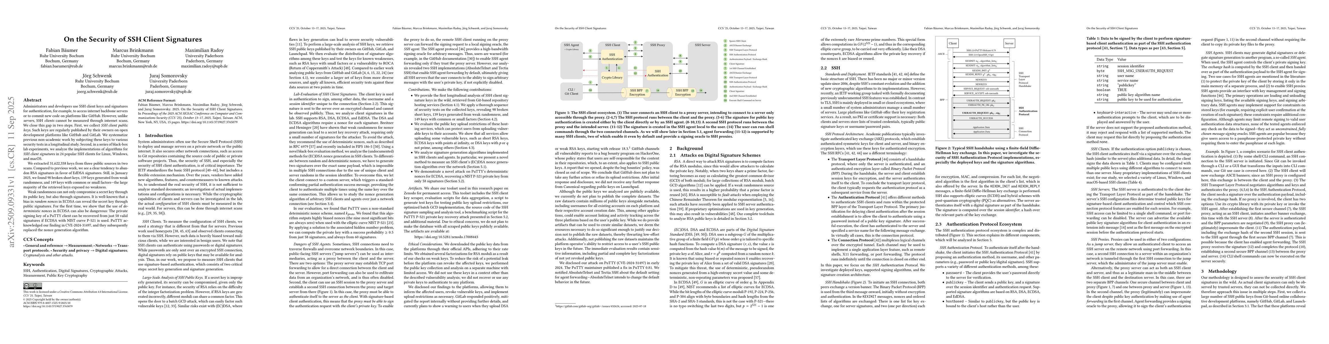 Administrators and developers use SSH client keys and signatures for authentication, for example, to access internet backbone servers or to commit new code on platforms like GitHub. However, unlike servers, SSH clients cannot be measured through internet scans. We close this gap in two steps. First, we collect SSH client public keys. Such keys are regularly published by their owners on open development platforms like GitHub and GitLab. We systematize previous non-academic work by subjecting these keys to various security tests in a longitudinal study. Second, in a series of black-box lab experiments, we analyze the implementations of algorithms for SSH client signatures in 24 popular SSH clients for Linux, Windows, and macOS. We extracted 31,622,338 keys from three public sources in two scans. Compared to previous work, we see a clear tendency to abandon RSA signatures in favor of EdDSA signatures. Still, in January 2025, we found 98 broken short keys, 139 keys generated from weak randomness, and 149 keys with common or small factors-the large majority of the retrieved keys exposed no weakness. Weak randomness can not only compromise a secret key through its public key, but also through signatures. It is well-known that a bias in random nonces in ECDSA can reveal the secret key through public signatures. For the first time, we show that the use of deterministic nonces in ECDSA can also be dangerous: The private signing key of a PuTTY client can be recovered from just 58 valid signatures if ECDSA with NIST curve P-521 is used. PuTTY acknowledged our finding in CVE-2024-31497, and they subsequently replaced the nonce generation algorithm.