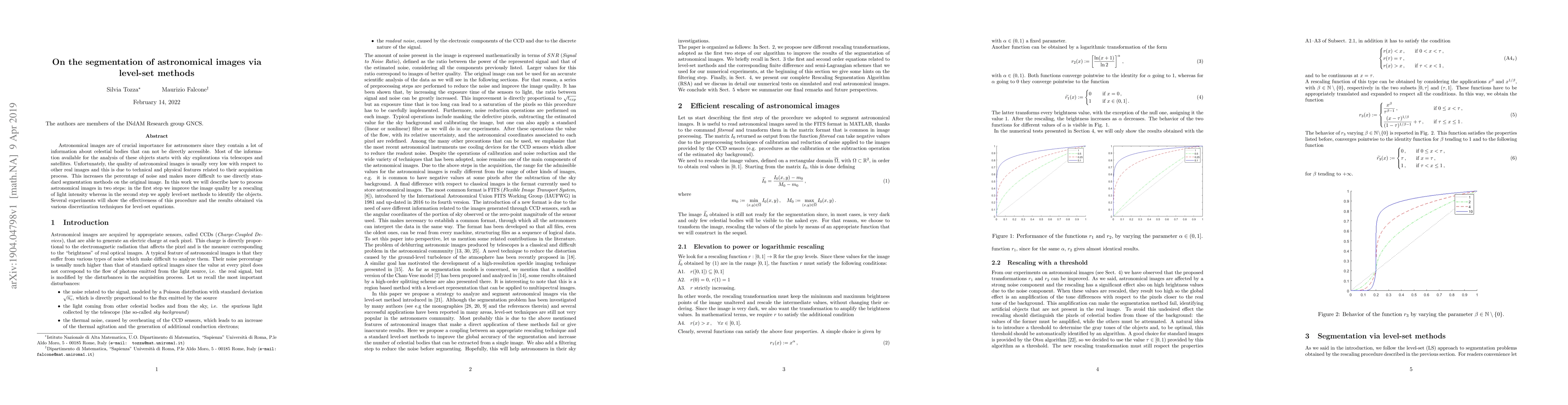 Astronomical images are of crucial importance for astronomers since they contain a lot of information about celestial bodies that can not be directly accessible. Most of the information available for the analysis of these objects starts with sky explorations via telescopes and satellites. Unfortunately, the quality of astronomical images is usually very low with respect to other real images and this is due to technical and physical features related to their acquisition process. This increases the percentage of noise and makes more difficult to use directly standard segmentation methods on the original image. In this work we will describe how to process astronomical images in two steps: in the first step we improve the image quality by a rescaling of light intensity whereas in the second step we apply level-set methods to identify the objects. Several experiments will show the effectiveness of this procedure and the results obtained via various discretization techniques for level-set equations.