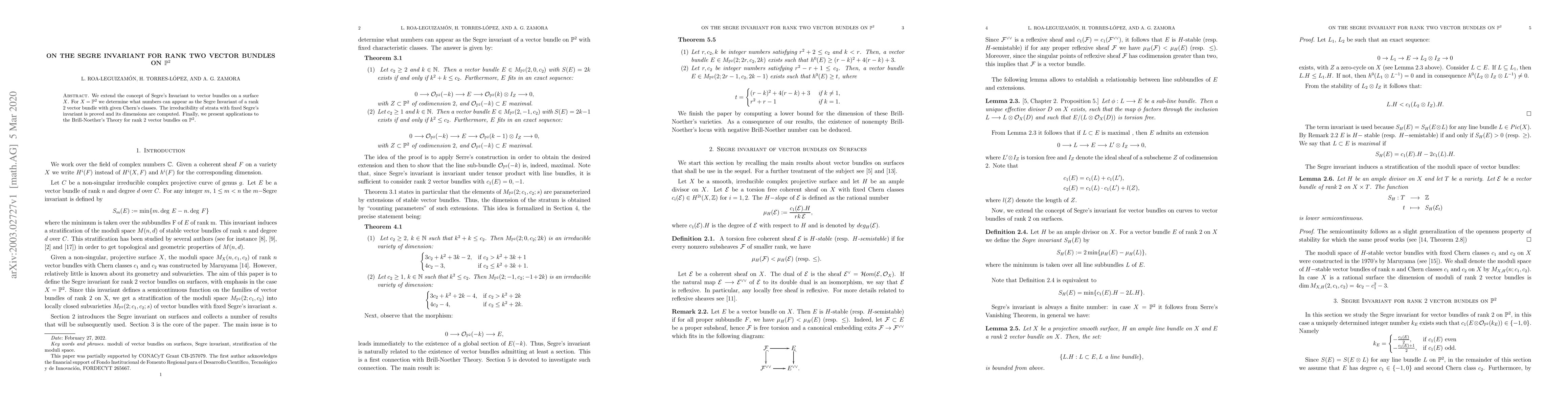 This paper extends Segre's Invariant to rank two vector bundles on projective plane $\mathbb{P}^2$, determining possible values given Chern classes, proving irreducibility of strata with fixed invariants, and computing their dimensions. It also applies these findings to Brill-Noether Theory for rank two bundles on $\mathbb{P}^2$.