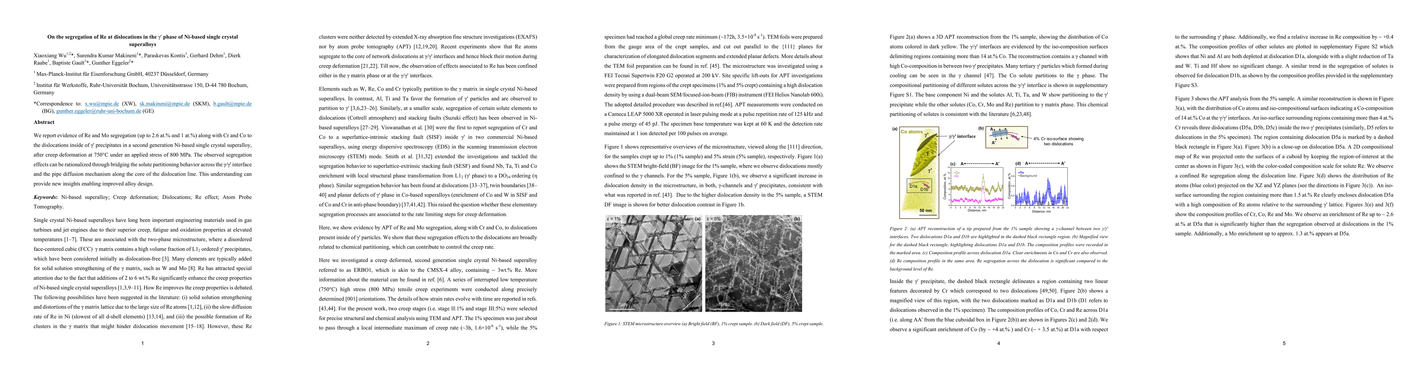 This study shows that Re and Mo segregate to dislocations within {\gamma}' precipitates in Ni-based superalloys after creep deformation, with implications for solute partitioning and pipe diffusion mechanisms. These findings could aid in designing better superalloys.
