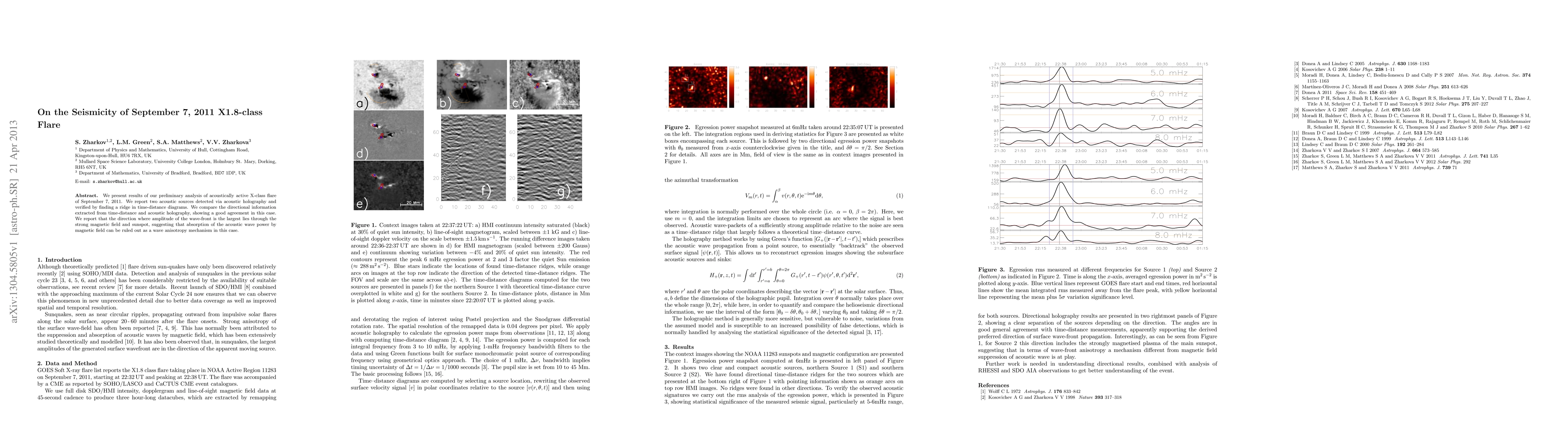 We present results of our preliminary analysis of acoustically active X-class flare of September 7, 2011. We report two acoustic sources detected via acoustic holography and verified by finding a ridge in time-distance diagrams. We compare the directional information extracted from time-distance and acoustic holography, showing a good agreement in this case. We report that the direction where amplitude of the wave-front is the largest lies through the strong magnetic field and sunspot, suggesting that absorption of the acoustic wave power by magnetic field can be ruled out as a wave anisotropy mechanism in this case.