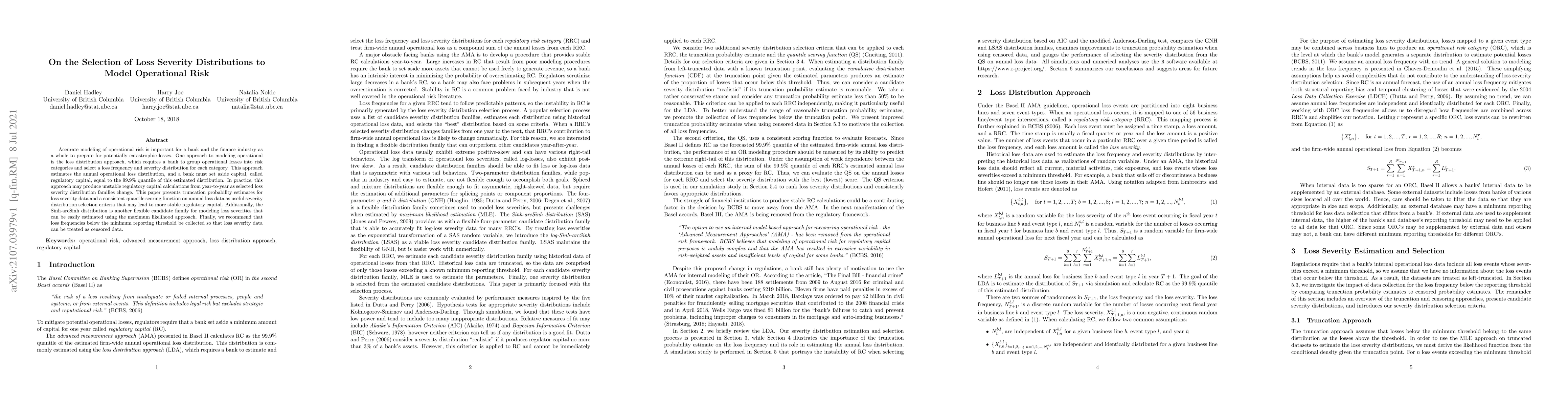 Accurate modeling of operational risk is important for a bank and the finance industry as a whole to prepare for potentially catastrophic losses. One approach to modeling operational is the loss distribution approach, which requires a bank to group operational losses into risk categories and select a loss frequency and severity distribution for each category. This approach estimates the annual operational loss distribution, and a bank must set aside capital, called regulatory capital, equal to the 0.999 quantile of this estimated distribution. In practice, this approach may produce unstable regulatory capital calculations from year-to-year as selected loss severity distribution families change. This paper presents truncation probability estimates for loss severity data and a consistent quantile scoring function on annual loss data as useful severity distribution selection criteria that may lead to more stable regulatory capital. Additionally, the Sinh-arcSinh distribution is another flexible candidate family for modeling loss severities that can be easily estimated using the maximum likelihood approach. Finally, we recommend that loss frequencies below the minimum reporting threshold be collected so that loss severity data can be treated as censored data.