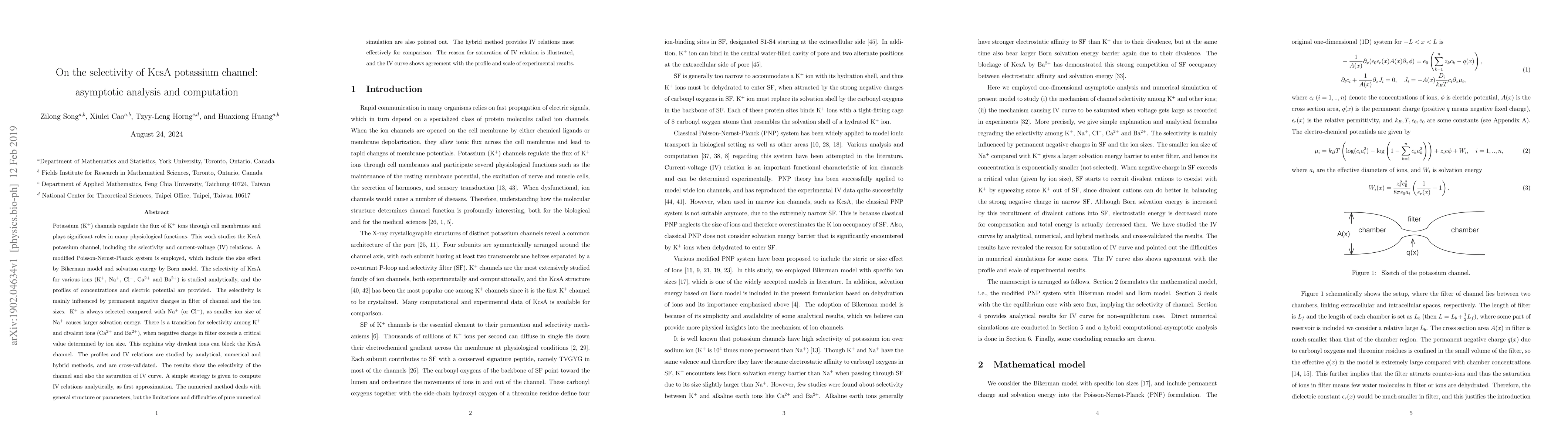 Researchers studied the KcsA potassium channel using a modified system that considers ion size and solvation energy, finding that it preferentially allows potassium ions to pass through while excluding sodium and divalent ions.