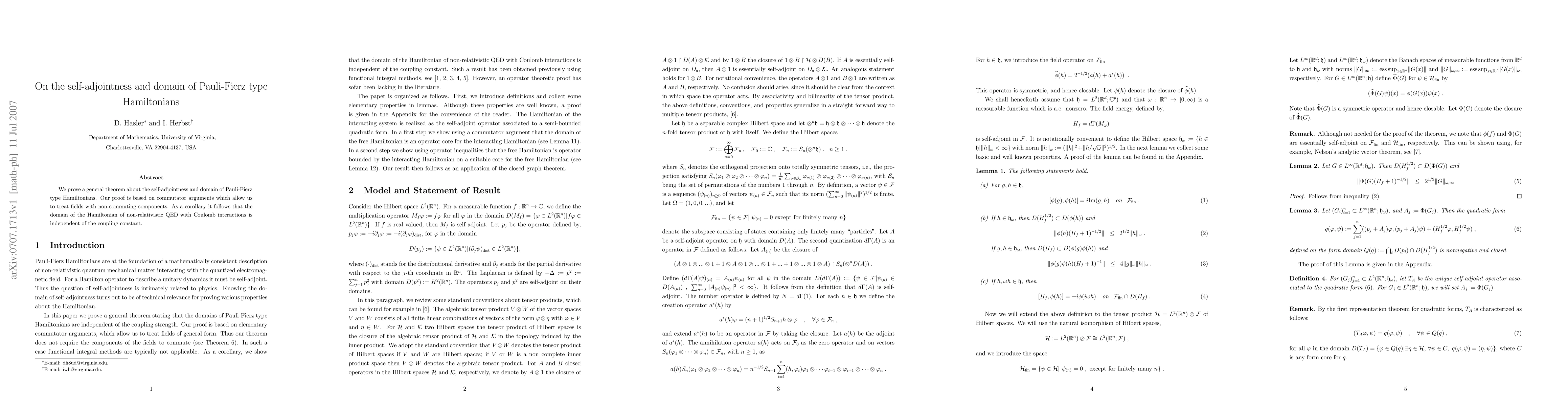 This paper establishes a theorem on the self-adjointness and domain of Pauli-Fierz type Hamiltonians using commutator arguments, and as a result, demonstrates that the domain of the Hamiltonian in non-relativistic QED with Coulomb interactions does not depend on the coupling constant.