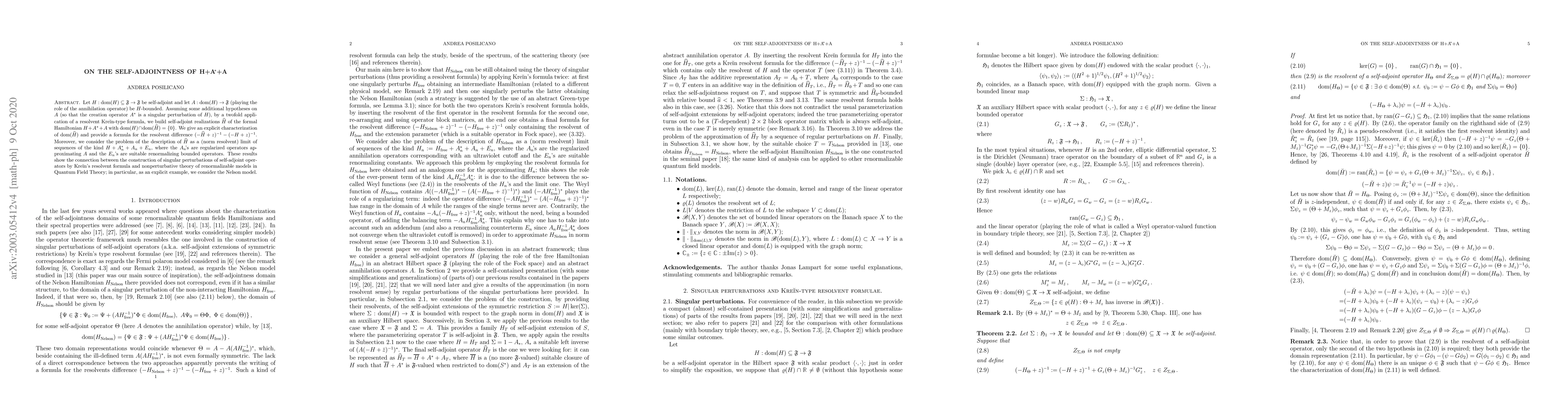 Let $H:D(H)\subseteq{\mathscr F}\to{\mathscr F}$ be self-adjoint and let $A:D(H)\to{\mathscr F}$ (playing the role of the annihilator operator) be $H$-bounded. Assuming some additional hypotheses on $A$ (so that the creation operator $A^{*}$ is a singular perturbation of $H$), by a twofold application of a resolvent Krein-type formula, we build self-adjoint realizations $\hat H$ of the formal Hamiltonian $H+A^{*}+A$ with $D(H)\cap D(\hat H)=\{0\}$. We give an explicit characterization of $D(\hat H)$ and provide a formula for the resolvent difference $(-\hat H+z)^{-1}-(-H+z)^{-1}$. Moreover, we consider the problem of the description of $\hat H$ as a (norm resolvent) limit of sequences of the kind $H+A^{*}_{n}+A_{n}+E_{n}$, where the $A_{n}\!$'s are regularized operators approximating $A$ and the $E_{n}$'s are suitable renormalizing bounded operators. These results show the connection between the construction of singular perturbations of self-adjoint operators by Krein's resolvent formula and nonperturbative theory of renormalizable models in Quantum Field Theory; in particular, as an explicit example, we consider the Nelson model.