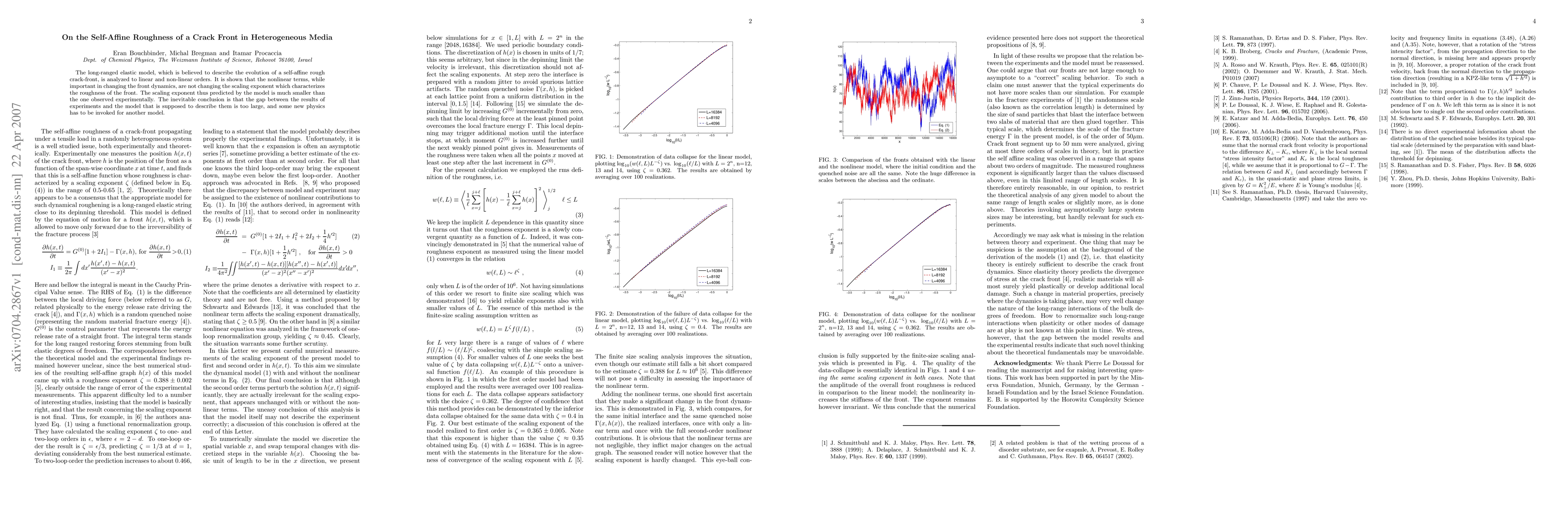 The long-ranged elastic model, which is believed to describe the evolution of a self-affine rough crack-front, is analyzed to linear and non-linear orders. It is shown that the nonlinear terms, while important in changing the front dynamics, are not changing the scaling exponent which characterizes the roughness of the front. The scaling exponent thus predicted by the model is much smaller than the one observed experimentally. The inevitable conclusion is that the gap between the results of experiments and the model that is supposed to describe them is too large, and some new physics has to be invoked for another model.
